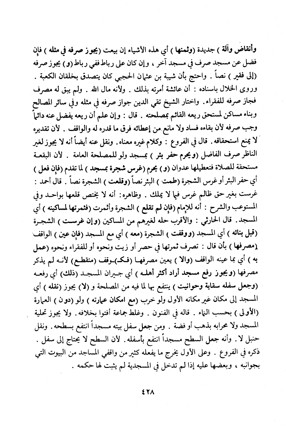 قَالَ الْحَارِثِيُّ: وَالْأَقْرَبُ حِلُّهُ لِغَيْرِهِمْ مِنْ الْمَسَاكِينِ (وَإِنْ غُرِسَتْ) الشَّجَرَةُ (قَبْلَ بِنَائِهٍ) أَيْ الْمَسْجِدِ (وَوُقِفَتْ) الشَّجَرَةُ (مَعَهُ) أَيْ مَعَ الْمَسْجِدِ (فَإِنْ عَيَّنَ) الْوَاقِفُ (مَصْرِفَهَا) بِأَنْ قَالَ: تُصْرَفُ ثَمَرَتُهَا فِي حُصْرٍ أَوْ زَيْتٍ وَنَحْوِهِ أَوْ لِلْفُقَرَاءِ وَنَحْوِهِ (عُمِلَ بِهِ) أَيْ بِمَا عَيَّنَهُ الْوَاقِفُ (وَإِلَّا) يُعَيَّنْ مَصْرِفُهَا (فَكَ) وَقْفٍ (مُنْقَطِعٍ) لِأَنَّهُ لَمْ يَذْكُرْ مَصْرِفَهَا (وَيَجُوزُ رَفْعُ مَسْجِدٍ أَرَادَ أَكْثَرُ أَهْلِهِ) أَيْ جِيرَانُ الْمَسْجِدِ (ذَلِكَ) أَيْ رَفْعَهُ (وَجَعْلَ سُفْلِهِ سِقَايَةً وَحَوَانِيتَ) يُنْتَفَعُ بِهَا لِمَا فِيهِ مِنْ الْمَصْلَحَةِ وَ (لَا) يَجُوزُ (نَقْلُهُ) أَيْ الْمَسْجِدِ إلَى مَكَان غَيْرِ مَكَانَهُ الْأَوَّلِ وَلَوْ خَرِبَ (مَعَ إمْكَانَ عِمَارَتِهِ) وَلَوْ (دُونَ) الْعِمَارَةِ (الْأُولَى) بِحَسَبِ النَّمَاءِ. قَالَهُ فِي الْفُنُونِ. وَغَلِطَ جَمَاعَةٌ أَفْتَوْا بِخِلَافِهِ. وَلَا يَجُوزُ تَحْلِيَةُ الْمَسْجِدِ وَلَا مِحْرَابِهِ بِذَهَبٍ أَوْ فِضَّةٍ. وَمَنْ جَعَلَ سُفْلَ بَيْتِهِ مَسْجِدًا انْتَفَعَ بِسَطْحِهِ. وَنَقَلَ حَنْبَلٌ لَا. وَأَنَّهُ جَعَلَ السَّطْحَ مَسْجِدًا انْتَفَعَ بِأَسْفَلِهِ. لِأَنَّ السَّطْحَ لَا يَحْتَاجُ إلَى سُفْلٍ. ذَكَرَهُ فِي الْفُرُوعِ. وَعَلَى الْأَوَّلِ يَخْرُجُ مَا يَفْعَلُهُ كَثِيرٌ مِنْ وَاقِفِي الْمَسَاجِدِ مِنْ الْبُيُوتِ الَّتِي بِجَوَانِبِهِ، وَبَعْضُهَا عَلَيْهِ إذَا لَمْ تَدْخُلْ فِي الْمَسْجِدِيَّةِ لَمْ يَثْبُتْ لَهَا حُكْمَهُ.