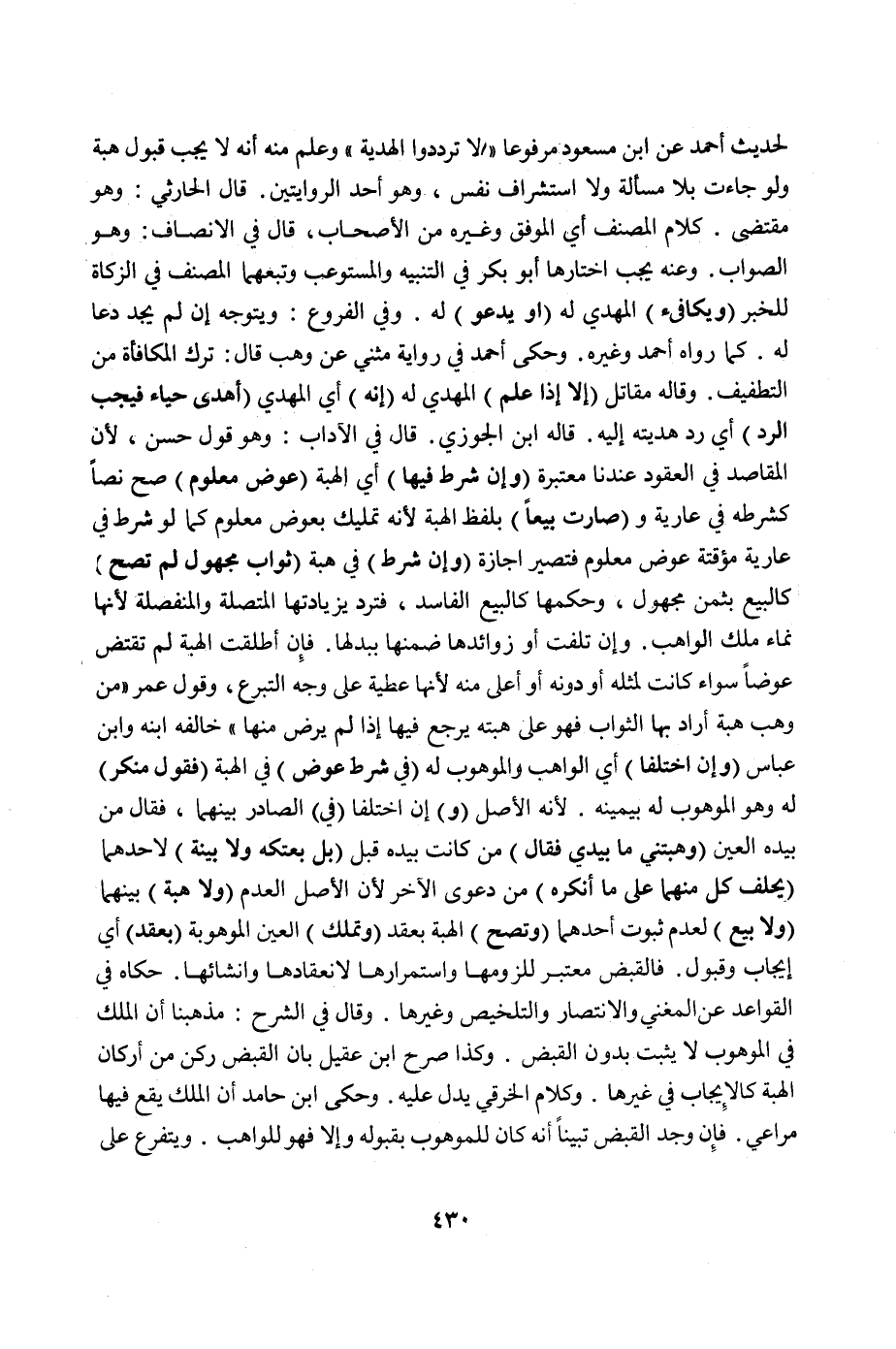 لِحَدِيثِ أَحْمَدَ عَنْ ابْنِ مَسْعُودٍ مَرْفُوعًا «لَا تَرُدُّوا الْهَدِيَّةَ» وَعُلِمَ مِنْهُ أَنَّهُ لَا يَجِبُ قَبُولُ هِبَةٍ وَلَوْ جَاءَتْ بِلَا مَسْأَلَةٍ وَلَا اسْتِشْرَافِ نَفْسٍ وَهُوَ أَحَدُ الرِّوَايَتَيْنِ.