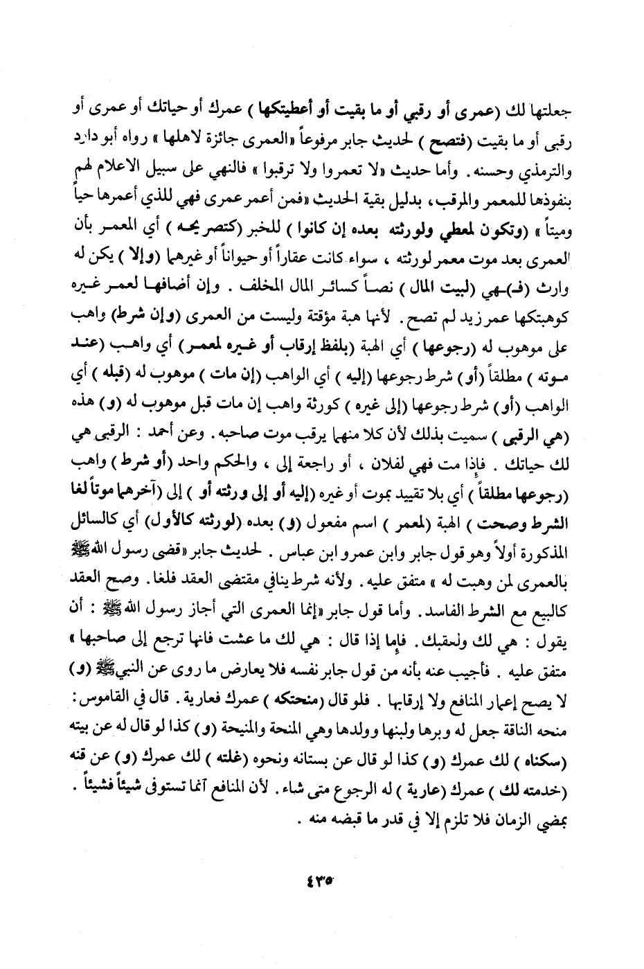 جَعَلْتُهَا لَكَ عُمْرَى أَوْ رُقْبَى أَوْ مَا بَقِيت أَوْ أَعْطَيْتُكَهَا عُمُرَكَ أَوْ حَيَاتَكَ أَوْ عُمْرَى أَوْ رُقْبَى أَوْ مَا بَقِيت فَتَصِحُّ لِحَدِيثِ جَابِرٍ مَرْفُوعًا «الْعُمْرَى جَائِزَةٌ لِأَهْلِهَا» رَوَاهُ أَبُو دَاوُد وَالتِّرْمِذِيُّ وَحَسَّنَهُ وَأَمَّا حَدِيثُ لَا تَعْمُرُوا وَلَا تَرْقُبُوا فَالنَّهْيُ عَلَى سَبِيلِ الْإِعْلَامِ لَهُمْ بِنُفُوذِهَا لِلْمُعْمَرِ وَالْمُرْقَبِ بِدَلِيلِ بَقِيَّةِ الْحَدِيثِ فَمَنْ أَعْمَرَ عُمْرَى فَهِيَ لِلَّذِي أَعْمَرَهَا حَيًّا وَمَيِّتًا وَتَكُونُ لِمُعْطِي وَلِوَرَثَتِهِ بَعْدَهُ إنْ كَانُوا لِلْخَبَرِ كَتَصْرِيحِهِ أَيْ: الْمُعْمِرِ بِأَنَّ الْعُمْرَى بَعْدَ مَوْتِ مُعْمَرٍ لِوَرَثَتِهِ سَوَاءٌ كَانَتْ عَقَارًا أَوْ حَيَوَانًا أَوْ غَيْرَهُمَا وَإِلَّا يَكُنْ لَهُ وَارِثٌ فَهِيَ لِبَيْتِ الْمَالِ نَصًّا كَسَائِرِ الْمَالِ الْمُخَلَّفِ وَإِنْ أَضَافَهَا لِعُمْرِ غَيْرِهِ كَوَهَبْتُكَهَا عُمْرَ زَيْدٍ لَمْ تَصِحَّ لِأَنَّهَا هِبَةٌ مُؤَقَّتَةٌ وَلَيْسَتْ مِنْ الْعُمْرَى