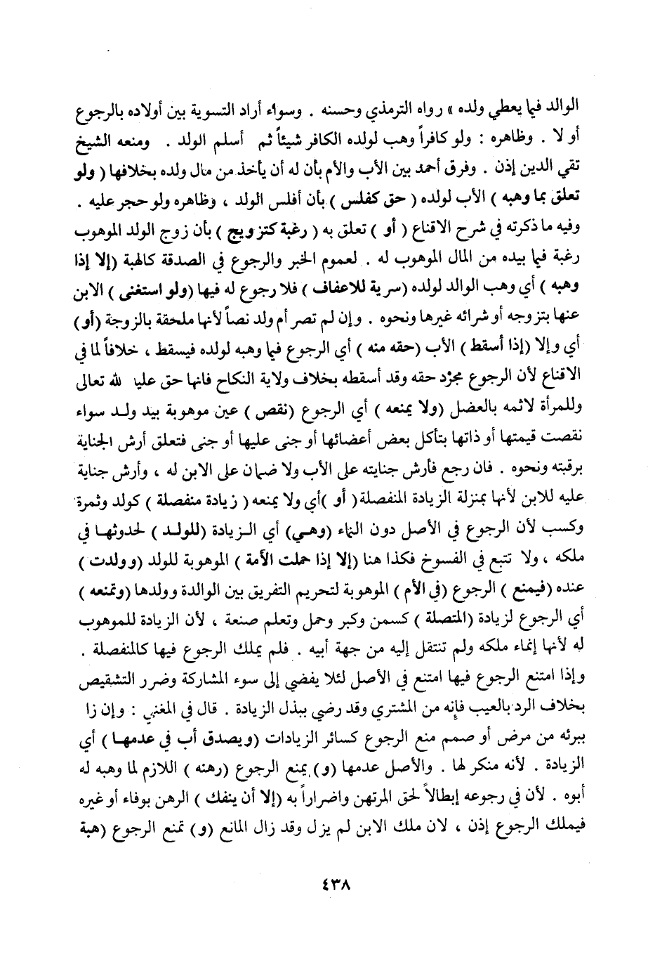 «لَيْسَ لِأَحَدٍ أَنْ يُعْطِيَ عَطِيَّةً ثُمَّ يَرْجِعَ فِيهَا إلَّا الْوَالِدُ فِيمَا يُعْطِي وَلَدَهُ» رَوَاهُ التِّرْمِذِيُّ وَحَسَّنَهُ. وَسَوَاءٌ أَرَادَ التَّسْوِيَةَ بَيْنَ أَوْلَادِهِ بِالرُّجُوعِ أَوْ لَا. وَظَاهِرُهُ: وَلَوْ كَافِرًا وَهَبَ لِوَلَدِهِ الْكَافِرِ شَيْئًا ثُمَّ أَسْلَمَ الْوَلَدُ. وَمَنَعَهُ الشَّيْخُ تَقِيُّ الدِّينِ إذَنْ. وَفَرَّقَ أَحْمَدُ بَيْنَ الْأَبِ وَالْأُمِّ بِأَنَّ لَهُ أَنْ يَأْخُذَ مِنْ مَالِ وَلَدِهِ بِخِلَافِهَا (وَلَوْ تَعَلَّقَ بِمَا وَهَبَهُ) الْأَبُ لِوَلَدِهِ (حَقٌّ كَفَلَسٍ) بِأَنْ أَفْلَسَ الْوَالِدُ، وَظَاهِرُهُ وَلَوْ حُجِرَ عَلَيْهِ. وَفِيهِ مَا ذَكَرْتُهُ فِي شَرْحِ الْإِقْنَاعِ (أَوْ) تَعَلَّقَ بِهِ (رَغْبَةً كَتَزْوِيجٍ) بِأَنْ زُوِّجَ الْوَلَدُ الْمَوْهُوبُ رَغْبَةً فِيمَا بِيَدِهِ مِنْ الْمَالِ الْمَوْهُوبِ لَهُ. لِعُمُومِ الْخَبَرِ وَالرُّجُوعُ فِي الصَّدَقَةِ كَالْهِبَةِ (إلَّا إذَا وَهَبَهُ) أَيْ: وَهَبَ الْوَالِدُ لِوَلَدِهِ (سُرِّيَّةً لِلْإِعْفَافِ) فَلَا رُجُوعَ لَهُ فِيهَا (وَلَوْ اسْتَغْنَى) الِابْنُ عَنْهَا بِتَزَوُّجِهِ أَوْ شِرَائِهِ غَيْرَهَا وَنَحْوِهِ. وَإِنْ لَمْ تَصِرْ أُمَّ وَلَدٍ نَصًّا لِأَنَّهَا مُلْحَقَةٌ بِالزَّوْجَةِ (أَوْ) أَيْ: وَإِلَّا (إذَا أَسْقَطَ) الْأَبُ (حَقَّهُ مِنْهُ) أَيْ: الرُّجُوعِ فِيمَا وَهَبَهُ لِوَلَدِهِ فَيَسْقُطُ، خِلَافًا لِمَا فِي الْإِقْنَاعِ لِأَنَّ الرُّجُوعَ مُجَرَّدُ حَقِّهِ وَقَدْ أَسْقَطَهُ بِخِلَافِ وِلَايَةِ النِّكَاحِ فَإِنَّهَا حَقٌّ عَلَيْهِ لِلَّهِ تَعَالَى وَلِلْمَرْأَةِ لِإِثْمِهِ بِالْعَضْلِ (وَلَا يَمْنَعُهُ) أَيْ: الرُّجُوعَ (نَقْصُ) عَيْنٍ مَوْهُوبَةٍ بِيَدِ وَلَدٍ سَوَاءٌ نَقَصَتْ قِيمَتُهَا أَوْ ذَاتُهَا بِتَآكُلِ بَعْضِ أَعْضَائِهَا أَوْ جُنِيَ عَلَيْهَا أَوْ جَنَى فَتَعَلَّقَ أَرْشُ الْجِنَايَةِ بِرَقَبَتِهِ وَنَحْوِهِ. فَإِنْ رَجَعَ فَأَرْشُ جِنَايَتِهِ عَلَى الْأَبِ وَلَا ضَمَانَ عَلَى الِابْنِ لَهُ، وَأَرْشُ جِنَايَةٍ عَلَيْهِ لِلِابْنِ لِأَنَّهَا بِمَنْزِلَةِ الزِّيَادَةِ الْمُنْفَصِلَةِ (أَوْ) أَيْ: وَلَا يَمْنَعُهُ (زِيَادَةٌ مُنْفَصِلَةٌ) كَوَلَدٍ وَثَمَرَةٍ وَكَسْبٍ لِأَنَّ الرُّجُوعَ فِي الْأَصْلِ دُونَ النَّمَاءِ (وَهِيَ) أَيْ الزِّيَادَةُ (لِلْوَلَدِ) لِحُدُوثِهَا فِي مِلْكِهِ، وَلَا تُتْبَعُ فِي الْفُسُوخِ فَكَذَا هُنَا (إلَّا إذَا حَمَلَتْ الْأَمَةُ) الْمَوْهُوبَةُ لِلْوَلَدِ (وَوَلَدَتْ) عِنْدَهُ (فَيُمْنَعُ) الرُّجُوعُ (فِي الْأُمِّ) الْمَوْهُوبَةِ لِتَحْرِيمِ التَّفْرِيقِ بَيْنَ الْوَالِدَةِ وَوَلَدِهَا (وَتَمْنَعُهُ) أَيْ: الرُّجُوعَ لِزِيَادَةٍ (الْمُتَّصِلَةُ) كَسِمَنٍ وَكِبَرٍ وَحَمْلٍ وَتَعَلُّمِ صَنْعَةٍ، لِأَنَّ الزِّيَادَةَ لِلْمَوْهُوبِ لَهُ لِأَنَّهَا إنْمَاءُ مِلْكِهِ وَلَمْ تَنْتَقِلْ إلَيْهِ مِنْ جِهَةِ أَبِيهِ. فَلَمْ يَمْلِكْ الرُّجُوعَ فِيهَا كَالْمُنْفَصِلَةِ. وَإِذَا امْتَنَعَ الرُّجُوعُ فِيهَا امْتَنَعَ فِي الْأَصْلِ لِئَلَّا يُفْضِيَ إلَى سُوءِ الْمُشَارَكَةِ وَضَرَرِ التَّشْقِيصِ بِخِلَافِ الرَّدِّ بِالْعَيْبِ فَإِنَّهُ مِنْ الْمُشْتَرِي وَقَدْ رَضِيَ بِبَذْلِ الزِّيَادَةِ. قَالَ فِي الْمُغْنِي: وَإِنْ زَادَ بِبُرْئِهِ مِنْ مَرَضٍ أَوْ صَمَمٍ مُنِعَ الرُّجُوعُ كَسَائِرِ الزِّيَادَاتِ (وَيُصَدَّقُ أَبٌ فِي عَدَمِهَا) أَيْ: الزِّيَادَةِ. لِأَنَّهُ مُنْكِرٌ لَهَا. وَالْأَصْلُ عَدَمُهَا.