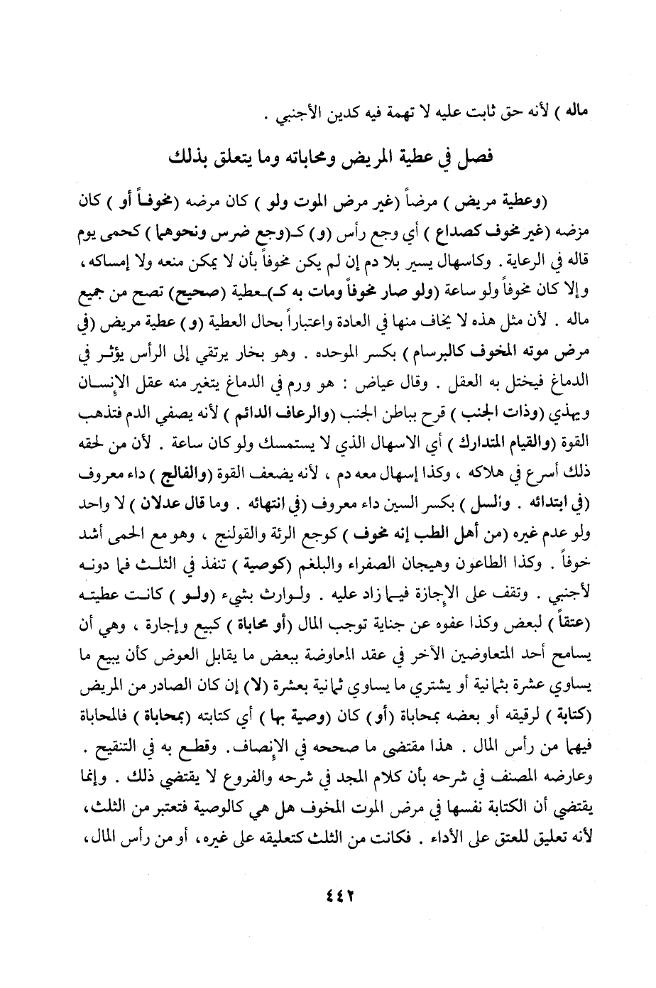 (وَ) عَطِيَّةُ مَرِيضٍ (فِي مَرَضِ مَوْتِهِ الْمَخُوفِ كَالْبِرْسَامِ) بِكَسْرِ الْمُوَحَّدَةِ. وَهُوَ بُخَارٌ يَرْتَقِي إلَى الرَّأْسِ يُؤَثِّرُ فِي الدِّمَاغِ فَيَخْتَلُّ بِهِ الْعَقْلُ. وَقَالَ عِيَاضٌ: هُوَ وَرَمٌ فِي الدِّمَاغِ يَتَغَيَّرُ مِنْهُ عَقْلُ الْإِنْسَانِ وَيَهْذِي (وَذَاتِ الْجَنْبِ) قُرُحٌ بِبَاطِنِ الْجَنْبِ (وَالرُّعَافِ الدَّائِمِ) لِأَنَّهُ يُصَفِّي الدَّمَ فَتَذْهَبُ الْقُوَّةُ (وَالْقِيَامِ الْمُتَدَارِكِ) أَيْ: الْإِسْهَالِ الَّذِي لَا يَسْتَمْسِكُ وَلَوْ كَانَ سَاعَةً لِأَنَّ مَنْ لَحِقَهُ ذَلِكَ أَسْرَعَ فِي هَلَاكِهِ، وَكَذَا إسْهَالٌ مَعَهُ دَمٌ، لِأَنَّهُ يُضْعِفُ الْقُوَّةَ (وَالْفَالِجِ) دَاءٌ مَعْرُوفٌ (فِي ابْتِدَائِهِ. وَالسِّلِّ) بِكَسْرِ السِّينِ دَاءٌ مَعْرُوفٌ (فِي انْتِهَائِهِ. وَمَا قَالَ عَدْلَانِ) لَا وَاحِدٌ وَلَوْ عُدِمَ غَيْرُهُ (مِنْ أَهْلِ الطِّبِّ إنَّهُ مَخُوفٌ) كَوَجَعِ الرِّئَةِ وَالْقُولَنْجِ، وَهُوَ مَعَ الْحُمَّى أَشَدُّ خَوْفًا. وَكَذَا الطَّاعُونُ وَهَيَجَانُ الصَّفْرَاءِ وَالْبَلْغَمِ (كَوَصِيَّةٍ) تُنَفَّذُ فِي الثُّلُثِ فَمَا دُونَهُ لِأَجْنَبِيٍّ. وَتَقِفُ عَلَى الْإِجَازَةِ فِيمَا زَادَ عَلَيْهِ. وَلِوَارِثٍ بِشَيْءٍ (وَلَوْ) كَانَتْ عَطِيَّتُهُ (عِتْقًا) لِبَعْضٍ وَكَذَا عَفْوُهُ عَنْ جِنَايَةٍ تُوجِبُ الْمَالَ (أَوْ مُحَابَاةً) كَبَيْعٍ وَإِجَارَةٍ، وَهِيَ أَنْ يُسَامِحَ أَحَدُ الْمُتَعَاوِضَيْنِ الْآخَرَ فِي عَقْدِ الْمُعَاوَضَةِ بِبَعْضِ مَا يُقَابِلُ الْعِوَضَ كَأَنْ يَبِيعَ مَا يُسَاوِي عَشَرَةً بِثَمَانِيَةٍ أَوْ يَشْتَرِيَ مَا يُسَاوِي ثَمَانِيَةً بِعَشَرَةٍ (لَا) إنْ كَانَ الصَّادِرُ مِنْ الْمَرِيضِ (كِتَابَةً) لِرَقِيقِهِ أَوْ بَعْضِهِ بِمُحَابَاةٍ (أَوْ) كَانَ (وَصِيَّةٍ بِهَا) أَيْ: كِتَابَتِهِ (بِمُحَابَاةٍ) فَالْمُحَابَاةُ فِيهِمَا مِنْ رَأْسِ الْمَالِ. هَذَا مُقْتَضَى مَا صَحَّحَهُ فِي الْإِنْصَافِ وَقَطَعَ بِهِ فِي التَّنْقِيحِ وَعَارَضَهُ الْمُصَنِّفُ فِي شَرْحِهِ بِأَنَّ كَلَامَ الْمَجْدِ فِي شَرْحِهِ وَالْفُرُوعِ لَا يَقْتَضِي ذَلِكَ. وَإِنَّمَا يَقْتَضِي أَنَّ الْكِتَابَةَ نَفْسَهَا فِي مَرَضِ الْمَوْتِ الْمَخُوفِ هَلْ هِيَ كَالْوَصِيَّةِ فَتُعْتَبَرُ مِنْ الثُّلُثِ، لِأَنَّهُ تَعْلِيقٌ لِلْعِتْقِ عَلَى الْأَدَاءِ. فَكَانَتْ مِنْ الثُّلُثِ كَتَعْلِيقِهِ عَلَى غَيْرِهِ، أَوْ مِنْ رَأْسِ الْمَالِ،