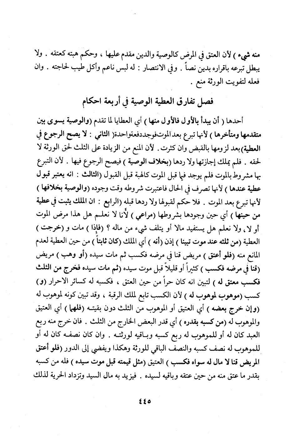 ٍ أَحَدُهَا (أَنْ يُبْدَأَ بِالْأَوَّلِ فَالْأَوَّلِ مِنْهَا) أَيْ: الْعَطَايَا لِمَا تَقَدَّمَ (وَالْوَصِيَّةُ يُسَوَّى بَيْنَ مُتَقَدِّمِهَا وَمُتَأَخِّرِهَا) لِأَنَّهَا تَبَرُّعٌ بَعْدَ الْمَوْتِ فَوُجِدَ دَفْعَةً وَاحِدَةً (الثَّانِي: لَا يَصِحُّ الرُّجُوعُ فِي الْعَطِيَّةِ) بَعْدَ لُزُومِهَا بِالْقَبْضِ وَإِنْ كَثُرَتْ. لِأَنَّ الْمَنْعَ مِنْ الزِّيَادَةِ عَلَى الثُّلُثِ لِحَقِّ الْوَرَثَةِ لَا لِحَقِّهِ. فَلَمْ يَمْلِكْ إجَازَتَهَا وَلَا رَدَّهَا (بِخِلَافِ الْوَصِيَّةِ) فَيَصِحُّ الرُّجُوعُ فِيهَا. لِأَنَّ التَّبَرُّعَ بِهَا مَشْرُوطٌ بِالْمَوْتِ فَلَمْ يُوجَدْ فِيمَا قَبْلَ الْمَوْتِ كَالْهِبَةِ قَبْلَ الْقَبُولِ (الثَّالِثُ: أَنَّهُ يُعْتَبَرُ قَبُولُ عَطِيَّةٍ عِنْدَهَا) لِأَنَّهَا تَصَرُّفٌ فِي الْحَالِ فَاعْتُبِرَتْ شُرُوطُهُ وَقْتَ وُجُودِهِ (وَالْوَصِيَّةُ بِخِلَافِهَا) لِأَنَّهَا تَبَرُّعٌ بَعْدَ الْمَوْتِ. فَلَا حُكْمَ لِقَبُولِهَا وَلَا رَدِّهَا قَبْلَهُ (الرَّابِعُ: أَنَّ الْمِلْكَ يَثْبُتُ فِي عَطِيَّةٍ مِنْ حِينِهَا) أَيْ: حِينِ وُجُودِهَا بِشُرُوطِهَا (مُرَاعًى) لِأَنَّا لَا نَعْلَمُ هَلْ هَذَا مَرَضُ الْمَوْتِ أَوْ لَا، وَلَا نَعْلَمُ هَلْ يَسْتَفِيدُ مَالًا أَوْ يَتْلَفُ شَيْءٌ مِنْ مَالِهِ؟ (فَإِذَا) مَاتَ وَ (خَرَجَتْ) الْعَطِيَّةُ (مِنْ ثُلُثِهِ عِنْدَ مَوْتٍ تَبَيُّنًا) إذَنْ (أَنَّهُ) أَيْ: الْمِلْكَ (كَانَ ثَابِتًا) مِنْ حِينِ الْعَطِيَّةِ لِعَدَمِ الْمَانِعِ مِنْهُ