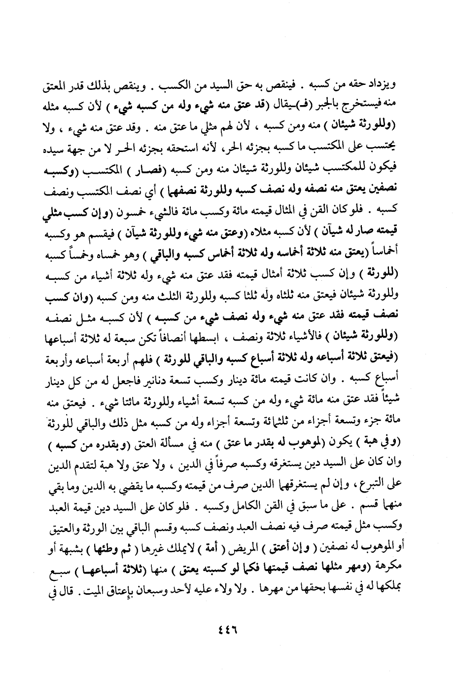 وَيَزْدَادُ حَقُّهُ مِنْ كَسْبِهِ. فَيَنْقُصُ بِهِ حَقُّ السَّيِّدِ مِنْ الْكَسْبِ. وَيَنْقُصُ بِذَلِكَ قَدْرُ الْمُعْتَقِ مِنْهُ فَيُسْتَخْرَجُ بِالْجَبْرِ (فَ) يُقَالُ (قَدْ عَتَقَ مِنْهُ شَيْءٌ وَلَهُ مِنْ كَسْبِهِ شَيْءٌ) لِأَنَّ كَسْبَهُ مِثْلُهُ (وَلِلْوَرَثَةِ شَيْئَانِ) مِنْهُ وَمِنْ كَسْبِهِ، لِأَنَّ لَهُمْ مِثْلَيْ مَا عَتَقَ مِنْهُ. وَقَدْ عَتَقَ مِنْهُ شَيْءٌ، وَلَا يُحْتَسَبُ عَلَى الْمُكْتَسِبِ مَا كَسَبَهُ بِجُزْئِهِ الْحُرِّ، لِأَنَّهُ اسْتَحَقَّهُ بِجُزْئِهِ الْحُرِّ لَا مِنْ جِهَةِ سَيِّدِهِ فَيَكُونُ لِلْمُكْتَسِبِ شَيْئَانِ وَلِلْوَرَثَةِ شَيْئَانِ مِنْهُ وَمِنْ كَسْبِهِ (فَصَارَ) الْمُكْتَسِبُ (وَكَسْبُهُ نِصْفَيْنِ يُعْتَقُ مِنْهُ نِصْفُهُ وَلَهُ نِصْفُ كَسْبِهِ وَلِلْوَرَثَةِ نِصْفُهُمَا) أَيْ: نِصْفُ الْمُكْتَسِبِ وَنِصْفُ كَسْبِهِ. فَلَوْ كَانَ الْقِنُّ فِي الْمِثَالِ قِيمَتُهُ مِائَةٌ وَكَسَبَ مِائَةً فَالشَّيْءُ خَمْسُونَ (وَإِنْ كَسَبَ مِثْلَيْ قِيمَتِهِ صَارَ لَهُ شَيْئَانِ) لِأَنَّ كَسْبَهُ مِثْلَاهُ (وَعَتَقَ مِنْهُ شَيْءٌ وَلِلْوَرَثَةِ شَيْئَانِ) فَيُقَسَّمُ هُوَ وَكَسْبُهُ أَخْمَاسًا (يُعْتَقُ مِنْهُ ثَلَاثَةُ أَخْمَاسِهِ وَلَهُ ثَلَاثَةُ أَخْمَاسِ كَسْبِهِ وَالْبَاقِي) وَهُوَ خُمُسَاهُ وَخُمُسَا كَسْبِهِ (لِلْوَرَثَةِ) وَإِنْ كَسَبَ ثَلَاثَةَ أَمْثَالِ قِيمَتِهِ فَقَدْ عَتَقَ مِنْهُ شَيْءٌ وَلَهُ ثَلَاثَةُ أَشْيَاءَ مِنْ كَسْبِهِ وَلِلْوَرَثَةِ شَيْئَانِ فَيُعْتَقُ مِنْهُ ثُلُثَاهُ وَلَهُ ثُلُثَا كَسْبِهِ وَلِلْوَرَثَةِ الثُّلُثُ مِنْهُ وَمِنْ كَسْبِهِ (وَإِنْ كَسَبَ نِصْفَ قِيمَتِهِ فَقَدْ عَتَقَ مِنْهُ شَيْءٌ وَلَهُ نِصْفُ شَيْءٍ مِنْ كَسْبِهِ) لِأَنَّ كَسْبَهُ مِثْلُ نِصْفِهِ (وَلِلْوَرَثَةِ شَيْئَانِ) فَالْأَشْيَاءُ ثَلَاثَةٌ وَنِصْفٌ، اُبْسُطْهَا أَنْصَافًا تَكُنْ سَبْعَةً لَهُ ثَلَاثَةُ أَسْبَاعِهَا (فَيُعْتَقُ ثَلَاثَةُ أَسْبَاعِهِ وَلَهُ ثَلَاثَةُ أَسْبَاعِ كَسْبِهِ وَالْبَاقِي لِلْوَرَثَةِ) فَلَهُمْ أَرْبَعَةُ أَسْبَاعِهِ وَأَرْبَعَةُ أَسْبَاعِ كَسْبِهِ. وَإِنْ كَانَتْ قِيمَتُهُ مِائَةَ دِينَارٍ وَكَسَبَ تِسْعَةَ دَنَانِيرَ فَاجْعَلْ لَهُ مِنْ كُلِّ دِينَارٍ شَيْئًا فَقَدْ عَتَقَ مِنْهُ مِائَةُ شَيْءٍ وَلَهُ مِنْ كَسْبِهِ تِسْعَةُ أَشْيَاءَ وَلِلْوَرَثَةِ مِائَتَا شَيْءٍ. فَيُعْتَقُ مِنْهُ مِائَةُ جُزْءٍ وَتِسْعَةُ أَجْزَاءٍ مِنْ ثَلَاثِمِائِةٍ وَتِسْعَةِ أَجْزَاءٍ وَلَهُ مِنْ كَسْبِهِ مِثْلُ ذَلِكَ وَالْبَاقِي لِلْوَرَثَةِ (وَفِي هِبَةٍ) يَكُونُ (لِمَوْهُوبٍ لَهُ بِقَدْرِ مَا عَتَقَ) مِنْهُ فِي مَسْأَلَةِ الْعِتْقِ (وَبِقَدْرِهِ مِنْ كَسْبِهِ) وَإِنْ كَانَ عَلَى السَّيِّدِ دَيْنٌ يَسْتَغْرِقُهُ وَكَسْبُهُ صُرِفَا فِي الدَّيْنِ، وَلَا عِتْقَ وَلَا هِبَةَ لِتَقَدُّمِ الدَّيْنِ عَلَى التَّبَرُّعِ، وَإِنْ لَمْ يَسْتَغْرِقْهُمَا الدَّيْنُ صَرَفَ مِنْ قِيمَتِهِ وَكَسْبِهِ مَا يَقْضِي بِهِ الدَّيْنَ وَمَا بَقِيَ مِنْهُمَا قُسِّمَ عَلَى مَا سَبَقَ فِي الْقِنِّ الْكَامِلِ وَكَسْبِهِ. فَلَوْ كَانَ عَلَى السَّيِّدِ دَيْنٌ قِيمَةُ الْعَبْدِ وَكَسَبَ مِثْلَ قِيمَتِهِ صُرِفَ فِيهِ نِصْفُ الْعَبْدِ وَنِصْفُ كَسْبِهِ وَقُسِّمَ الْبَاقِي بَيْنَ الْوَرَثَةِ وَالْعَتِيقِ أَوْ الْمَوْهُوبِ لَهُ نِصْفَيْنِ