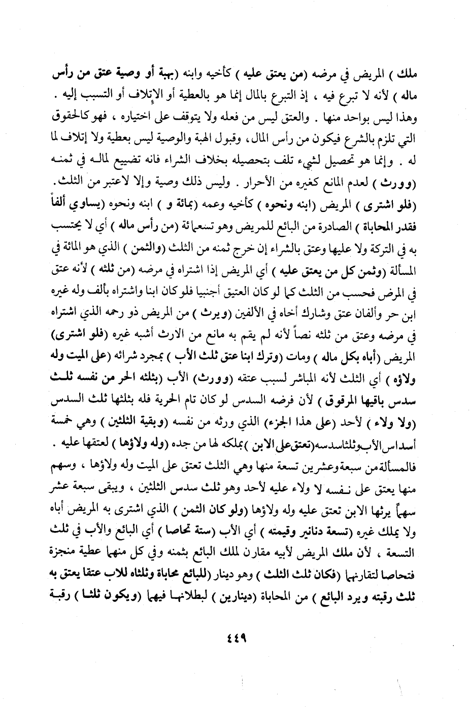 (فَلَوْ اشْتَرَى) الْمَرِيضُ (أَبَاهُ بِكُلِّ مَالِهِ) وَمَاتَ (وَتَرَكَ ابْنًا عَتَقَ ثُلُثُ الْأَبِ) بِمُجَرَّدِ شِرَائِهِ (عَلَى الْمَيِّتِ وَلَهُ وَلَاؤُهُ) أَيْ: الثُّلُثِ لِأَنَّهُ الْمُبَاشِرُ لِسَبَبِ عِتْقِهِ (وَوَرِثَ) الْأَبُ (بِثُلُثِهِ الْحُرِّ مِنْ نَفْسِهِ ثُلُثَ سُدُسِ بَاقِيهَا الْمَرْقُوقِ) لِأَنَّ فَرْضَهُ السُّدُسُ لَوْ كَانَ تَامَّ الْحُرِّيَّةِ فَلَهُ بِثُلُثِهَا ثُلُثُ السُّدُسِ (وَلَا وَلَاءَ) لِأَحَدٍ (عَلَى هَذَا الْجُزْءِ) الَّذِي وَرِثَهُ مِنْ نَفْسِهِ (وَبَقِيَّةُ الثُّلُثَيْنِ) وَهِيَ خَمْسَةُ أَسْدَاسِ الْأَبِ وَثُلُثَا سُدُسِهِ (تَعْتِقُ عَلَى الِابْنِ) بِمِلْكِهِ لَهَا مِنْ جَدِّهِ (وَلَهُ وَلَاؤُهَا) لِعِتْقِهَا عَلَيْهِ فَالْمَسْأَلَةُ مِنْ سَبْعَةٍ وَعِشْرِينَ تِسْعَةٌ مِنْهَا وَهِيَ الثُّلُثُ تَعْتِقُ عَلَى الْمَيِّتِ وَلَهُ وَلَاؤُهَا، وَسَهْمٌ مِنْهَا يَعْتِقُ عَلَى نَفْسِهِ لَا وَلَاءَ عَلَيْهِ لِأَحَدٍ وَهُوَ ثُلُثُ سُدُسِ الثُّلُثَيْنِ، وَيَبْقَى سَبْعَةَ عَشَرَ سَهْمًا يَرِثُهَا الِابْنُ تَعْتِقُ عَلَيْهِ وَلَهُ وَلَاؤُهَا (وَلَوْ كَانَ الثَّمَنُ) الَّذِي اشْتَرَى بِهِ الْمَرِيضُ أَبَاهُ وَلَا يَمْلِكُ غَيْرَهُ (تِسْعَةَ دَنَانِيرَ وَقِيمَتُهُ) أَيْ الْأَبِ (سِتَّةٌ تَحَاصَّا) أَيْ: الْبَائِعُ وَالْأَبُ فِي ثُلُثِ التِّسْعَةِ، لِأَنَّ مِلْكَ الْمَرِيضِ لِأَبِيهِ مُقَارَنٌ لِمِلْكِ الْبَائِعِ بِثَمَنِهِ وَفِي كُلٍّ مِنْهُمَا عَطِيَّةٌ مُنْجَزَةٌ فَتَحَاصَّا لِتَقَارُنِهِمَا (فَكَانَ ثُلُثُ الثُّلُثِ) وَهُوَ دِينَارٌ (لِلْبَائِعِ مُحَابَاةً وَثُلُثَاهُ لِلْأَبِ عِتْقًا يُعْتَقُ بِهِ ثُلُثُ رَقَبَتِهِ وَيَرُدُّ الْبَائِعُ) مِنْ الْمُحَابَاةِ (دِينَارَيْنِ) لِبُطْلَانِهَا فِيهِمَا (وَيَكُونُ ثُلُثَا) رَقَبَةِ