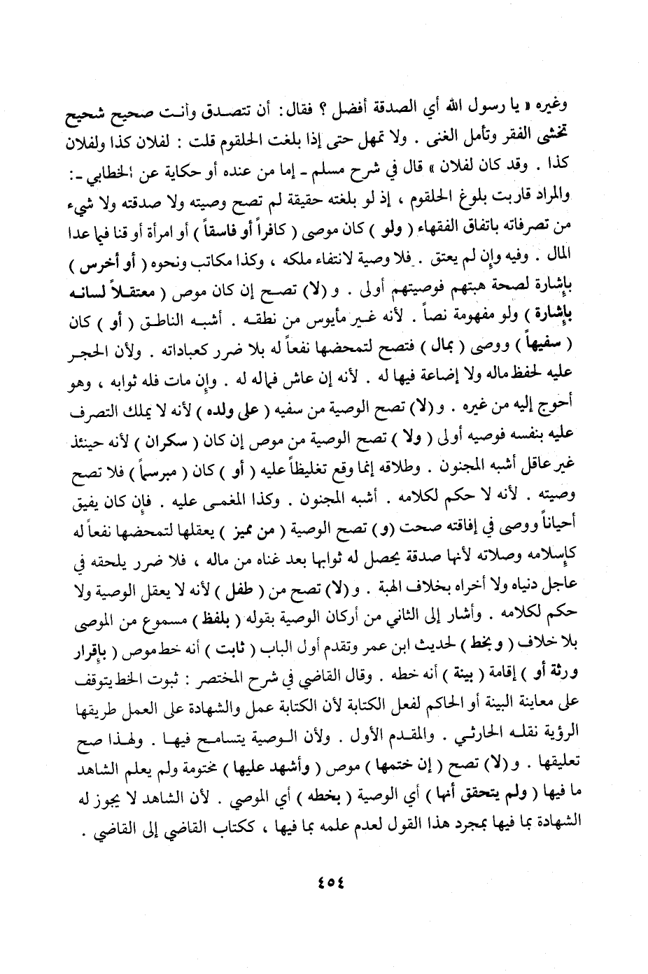 وَغَيْرِهِ " «يَا رَسُولَ اللَّهِ أَيُّ الصَّدَقَةِ أَفْضَلُ؟ فَقَالَ: أَنْ تَتَصَدَّقَ وَأَنْتَ صَحِيحٌ شَحِيحٌ تَخْشَى الْفَقْرَ وَتَأْمَلُ الْغِنَى. وَلَا تُمْهِلْ حَتَّى إذَا بَلَغَتْ الْحُلْقُومَ قُلْتَ: لِفُلَانٍ كَذَا وَلِفُلَانٍ كَذَا. وَقَدْ كَانَ لِفُلَانٍ» " قَالَ فِي شَرْحِ مُسْلِمٍ إمَّا مِنْ عِنْدَهُ أَوْ حِكَايَةٍ عَنْ الْخَطَّابِيِّ: وَالْمُرَادُ قَارَبَتْ بُلُوغَ الْحُلْقُومِ، إذْ لَوْ بَلَغَتْهُ حَقِيقَةً لَمْ تَصِحَّ وَصِيَّتُهُ وَلَا صَدَقَتُهُ وَلَا شَيْءَ مِنْ تَصَرُّفَاتِهِ بِاتِّفَاقِ الْفُقَهَاءِ (وَلَوْ) كَانَ مُوصٍ (كَافِرًا أَوْ فَاسِقًا) أَوْ امْرَأَةً أَوْ قِنًّا فِيمَا عَدَا الْمَالَ. وَفِيهِ وَإِنْ لَمْ يُعْتَقْ. فَلَا وَصِيَّةَ لِانْتِفَاءِ مِلْكِهِ، وَكَذَا مُكَاتَبٌ وَنَحْوُهُ (أَوْ أَخْرَسَ) بِإِشَارَةٍ لِصِحَّةِ هِبَتِهِمْ فَوَصِيَّتُهُمْ أَوْلَى. وَ (لَا) تَصِحُّ إنْ كَانَ مُوصٍ (مُعْتَقَلًا لِسَانُهُ بِإِشَارَةٍ) وَلَوْ مَفْهُومَةً نَصًّا لِأَنَّهُ غَيْرُ مَأْيُوسٍ مِنْ نُطْقِهِ. أَشْبَهَ النَّاطِقَ (أَوْ) كَانَ (سَفِيهًا) وَوَصَّى (بِمَالٍ) فَتَصِحُّ لِتَمَحُّضِهَا نَفْعًا لَهُ بِلَا ضَرَرٍ كَعِبَادَاتِهِ. وَلِأَنَّ الْحَجْرَ عَلَيْهِ لِحِفْظِ مَالِهِ وَلَا إضَاعَةَ فِيهَا لَهُ. لِأَنَّهُ إنْ عَاشَ فَمَالُهُ لَهُ. وَإِنْ مَاتَ فَلَهُ ثَوَابُهُ، وَهُوَ أَحْوَجُ إلَيْهِ مِنْ غَيْرِهِ. وَ (لَا) تَصِحُّ الْوَصِيَّةُ مِنْ سَفِيهٍ (عَلَى وَلَدِهِ) لِأَنَّهُ لَا يَمْلِكُ التَّصَرُّفَ عَلَيْهِ بِنَفْسِهِ فَوَصِيُّهُ أَوْلَى (وَلَا) تَصِحُّ الْوَصِيَّةُ مِنْ مُوصٍ إنْ كَانَ (سَكْرَانَ) لِأَنَّهُ حِينَئِذٍ غَيْرُ عَاقِلٍ أَشْبَهَ الْمَجْنُونَ. وَطَلَاقُهُ إنَّمَا وَقَعَ تَغْلِيظًا عَلَيْهِ (أَوْ) كَانَ (مُبَرْسَمًا) فَلَا تَصِحُّ وَصِيَّتُهُ. لِأَنَّهُ لَا حُكْمَ لِكَلَامِهِ. أَشْبَهَ الْمَجْنُونَ. وَكَذَا الْمُغْمَى عَلَيْهِ. فَإِنْ كَانَ يُفِيقُ أَحْيَانَا وَوَصَّى فِي إفَاقَتِهِ صَحَّتْ.