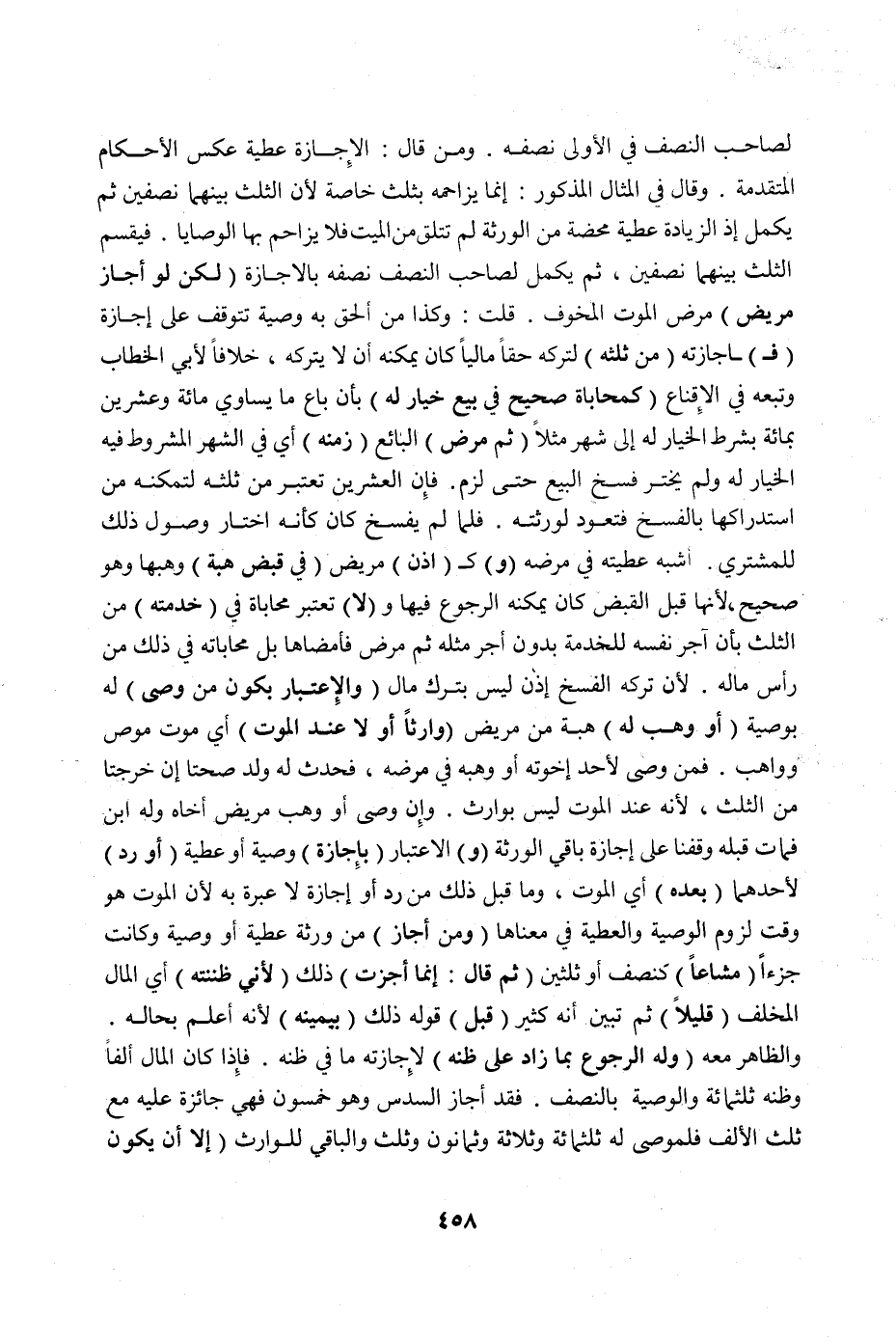 لِصَاحِبِ النِّصْفِ فِي الْأُولَى نِصْفُهُ. وَمَنْ قَالَ: الْإِجَازَةُ عَطِيَّةٌ عَكَسَ الْأَحْكَامَ الْمُتَقَدِّمَةَ. وَقَالَ فِي الْمِثَالِ الْمَذْكُورِ: إنَّمَا يُزَاحِمُهُ بِثُلُثٍ خَاصَّةً لِأَنَّ الثُّلُثَ بَيْنَهُمَا نِصْفَيْنِ ثُمَّ يُكْمِلُ إذْ الزِّيَادَةُ عَطِيَّةٌ مَحْضَةٌ مِنْ الْوَرَثَةِ لَمْ تَتَلَقَّ مِنْ الْمَيِّتِ فَلَا يُزَاحِمُ بِهَا الْوَصَايَا. فَيُقْسَمُ الثُّلُثُ بَيْنَهُمَا نِصْفَيْنِ، ثُمَّ يُكْمِلُ لِصَاحِبِ النِّصْفِ نِصْفُهُ بِالْإِجَازَةِ (لَكِنْ لَوْ أَجَازَ مَرِيضٌ) مَرَضَ الْمَوْتِ الْمَخُوفِ. قُلْتُ: وَكَذَا مَنْ أَلْحَقَ بِهِ وَصِيَّةً تَتَوَقَّفُ عَلَى إجَازَةٍ (فَ) إجَازَتُهُ (مِنْ ثُلُثِهِ) لِتَرْكِهِ حَقًّا مَالِيًّا كَانَ يُمْكِنُهُ أَنْ لَا يَتْرُكَهُ، خِلَافًا لِأَبِي الْخَطَّابِ وَتَبِعَهُ فِي الْإِقْنَاعِ (كَمُحَابَاةِ صَحِيحٍ فِي بَيْعِ خِيَارٍ لَهُ) بِأَنْ بَاعَ مَا يُسَاوِي مِائَةً وَعِشْرِينَ بِمِائَةٍ بِشَرْطِ الْخِيَارِ لَهُ إلَى شَهْرٍ مَثَلًا (ثُمَّ مَرِضَ) الْبَائِعُ (زَمَنَهُ) أَيْ فِي الشَّهْرِ الْمَشْرُوطِ فِيهِ الْخِيَارُ لَهُ وَلَمْ يَخْتَرْ فَسْخَ الْبَيْعِ حَتَّى لَزِمَ. فَإِنَّ الْعِشْرِينَ تُعْتَبَرُ مِنْ ثُلُثِهِ لِتَمَكُّنِهِ مِنْ اسْتِدْرَاكِهَا بِالْفَسْخِ فَتَعُودُ لِوَرَثَتِهِ. فَلَمَّا لَمْ يَفْسَخْ كَانَ كَأَنَّهُ اخْتَارَ وُصُولَ ذَلِكَ لِلْمُشْتَرِي. أَشْبَهَ عَطِيَّتَهُ فِي مَرَضِهِ (وَ) كَ (إذْنِ) مَرِيضٍ (فِي قَبْضِ هِبَةٍ) وَهَبَهَا وَهُوَ صَحِيحٌ، لِأَنَّهَا قَبْلَ الْقَبْضِ كَانَ يُمْكِنُهُ الرُّجُوعُ فِيهَا وَ (لَا) تُعْتَبَرُ مُحَابَاةٌ فِي (خِدْمَتِهِ) مِنْ الثُّلُثِ بِأَنْ أَجَّرَ نَفْسَهُ لِلْخِدْمَةِ بِدُونِ أَجْرِ مِثْلِهِ ثُمَّ مَرِضَ فَأَمْضَاهَا بَلْ مُحَابَاتُهُ فِي ذَلِكَ مِنْ رَأْسِ مَالِهِ. لِأَنَّ تَرْكَهُ الْفَسْخَ إذَنْ لَيْسَ بِتَرْكِ مَالٍ (وَالِاعْتِبَارُ بِكَوْنِ مَنْ وَصَّى) لَهُ بِوَصِيَّةٍ (أَوْ وَهَبَ لَهُ) هِبَةً مِنْ مَرِيضٍ (وَارِثًا أَوْ لَا عِنْدَ الْمَوْتِ) أَيْ مَوْتِ مُوصٍ وَوَاهِبٍ. فَمَنْ وَصَّى لِأَحَدِ إخْوَتِهِ أَوْ وَهَبَهُ فِي مَرَضِهِ، فَحَدَثَ لَهُ وَلَدٌ صَحَّتَا إنْ خَرَجَتَا مِنْ الثُّلُثِ، لِأَنَّهُ عِنْدَ الْمَوْتِ لَيْسَ بِوَارِثٍ. وَإِنْ وَصَّى أَوْ وَهَبَ مَرِيضٌ أَخَاهُ وَلَهُ ابْنٌ فَمَاتَ قَبْلَهُ وَقَفْنَا عَلَى إجَازَةِ بَاقِي الْوَرَثَةِ.