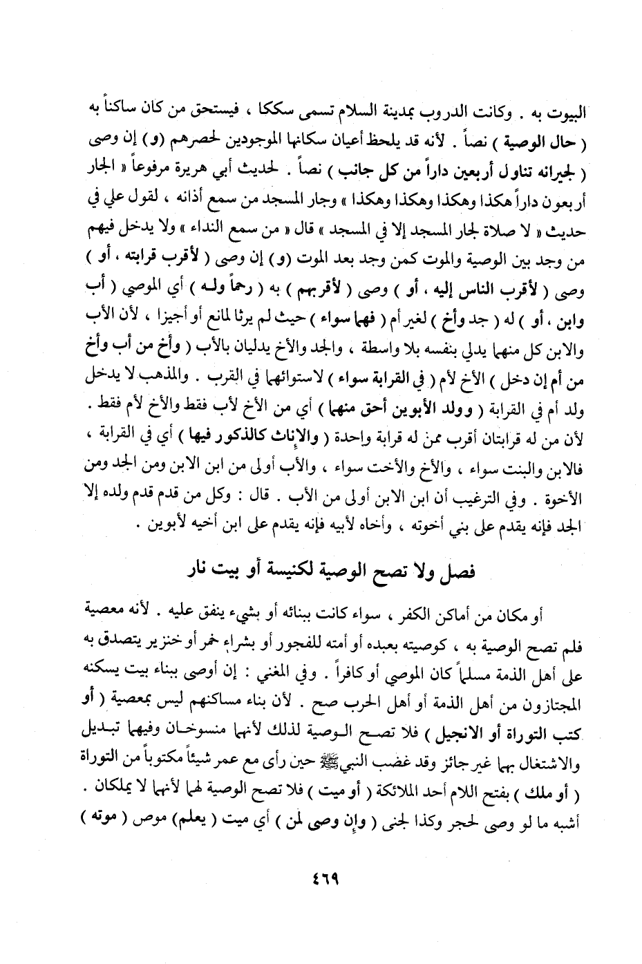 الْبُيُوتِ بِهِ. وَكَانَتْ الدُّرُوبُ بِمَدِينَةِ السَّلَامِ تُسَمَّى سِكَكًا، فَيَسْتَحِقُّ مَنْ كَانَ سَاكِنًا بِهِ (حَالَ الْوَصِيَّةِ) نَصًّا. لِأَنَّهُ قَدْ يَلْحَظُ أَعْيَانَ سُكَّانِهَا الْمَوْجُودِينَ لِحَصْرِهِمْ.