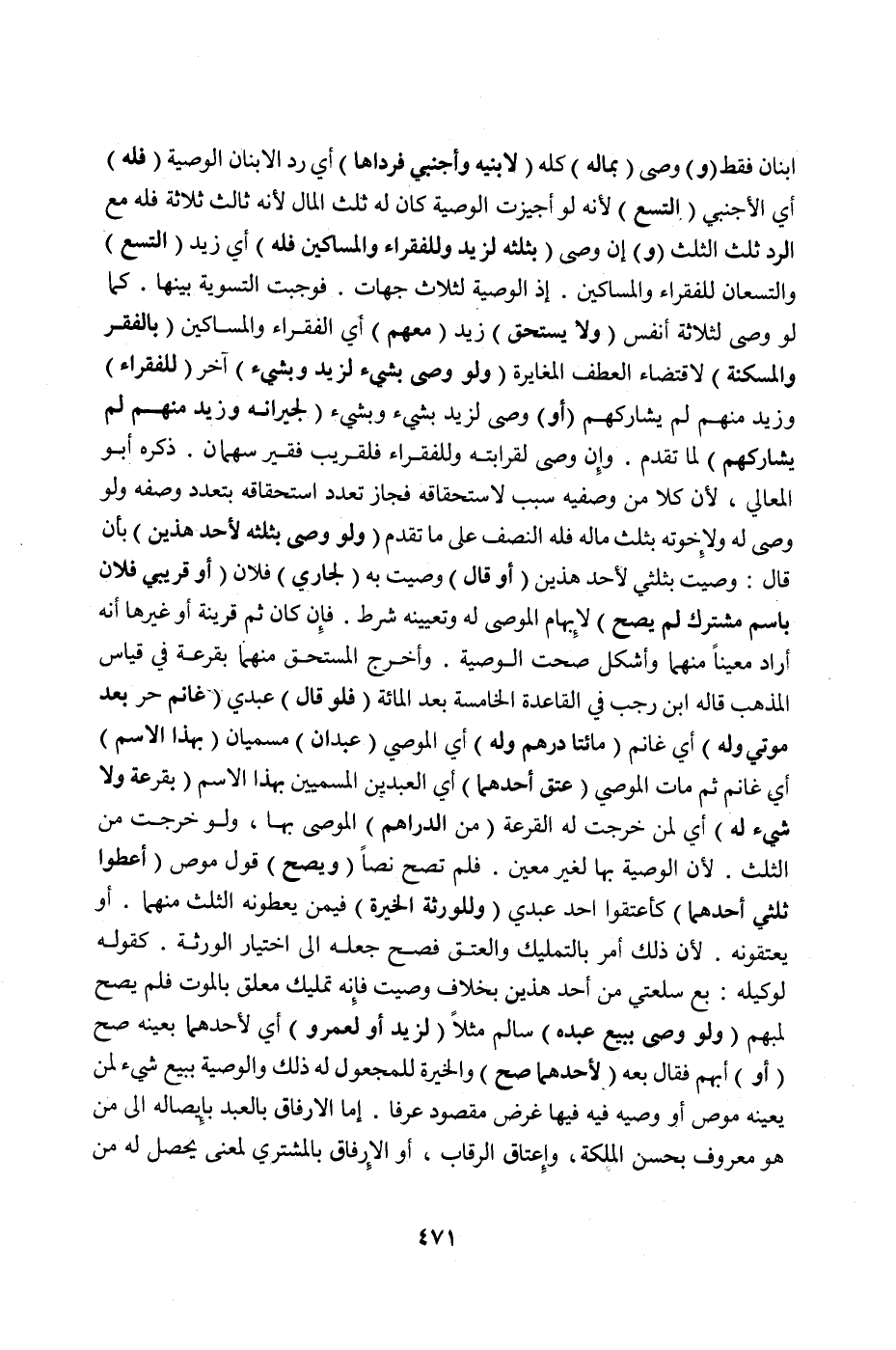 (وَ) إنْ وَصَّى (بِثُلُثِهِ لِزَيْدٍ وَلِلْفُقَرَاءِ وَالْمَسَاكِينِ فَلَهُ) أَيْ زَيْدٍ (التُّسْعِ) وَالتُّسْعَانِ لِلْفُقَرَاءِ وَالْمَسَاكِينِ. إذْ الْوَصِيَّةُ لِثَلَاثِ جِهَاتٍ. فَوَجَبَتْ التَّسْوِيَةُ بَيْنَهَا. كَمَا لَوْ وَصَّى لِثَلَاثَةِ أَنْفُسٍ (وَلَا يَسْتَحِقُّ) زَيْدٌ (مَعَهُمْ) أَيْ الْفُقَرَاءِ وَالْمَسَاكِينِ (بِالْفَقْرِ وَالْمَسْكَنَةِ) لِاقْتِضَاءِ الْعَطْفِ الْمُغَايَرَةَ (وَلَوْ وَصَّى بِشَيْءٍ لِزَيْدٍ وَبِشَيْءٍ) آخَرَ (لِلْفُقَرَاءِ) وَزَيْدٌ مِنْهُمْ لَمْ يُشَارِكْهُمْ (أَوْ) وَصَّى لِزَيْدٍ بِشَيْءٍ وَبِشَيْءٍ (لِجِيرَانِهِ وَزَيْدٌ مِنْهُمْ لَمْ يُشَارِكْهُمْ) لِمَا تَقَدَّمَ. وَإِنْ وَصَّى لِقَرَابَتِهِ وَلِلْفُقَرَاءِ فَلِقَرِيبٍ فَقِيرٍ سَهْمَانِ. ذَكَرَهُ أَبُو الْمَعَالِي، لِأَنَّ كُلًّا مِنْ وَصْفَيْهِ سَبَبٌ لِاسْتِحْقَاقِهِ فَجَازَ تَعَدُّدُ اسْتِحْقَاقِهِ بِتَعَدُّدِ وَصْفِهِ وَلَوْ وَصَّى لَهُ وَلِإِخْوَتِهِ بِثُلُثِ مَالِهِ فَلَهُ النِّصْفُ عَلَى مَا تَقَدَّمَ (وَلَوْ وَصَّى بِثُلُثِهِ لِأَحَدِ هَذَيْنِ) بِأَنْ قَالَ: وَصَّيْتُ بِثُلُثِي لِأَحَدِ هَذَيْنِ (أَوْ قَالَ) وَصَيْت بِهِ (لِجَارِي) فُلَانٍ (أَوْ قَرِيبِي فُلَانٍ بِاسْمٍ مُشْتَرَكٍ لَمْ يَصِحَّ) لِإِبْهَامِ الْمُوصَى لَهُ. وَتَعْيِينُهُ شَرْطٌ. فَإِنْ كَانَ ثَمَّ قَرِينَةٌ أَوْ غَيْرُهَا أَنَّهُ أَرَادَ مُعَيَّنًا مِنْهُمَا وَأَشْكَلَ صَحَّتْ الْوَصِيَّةُ.