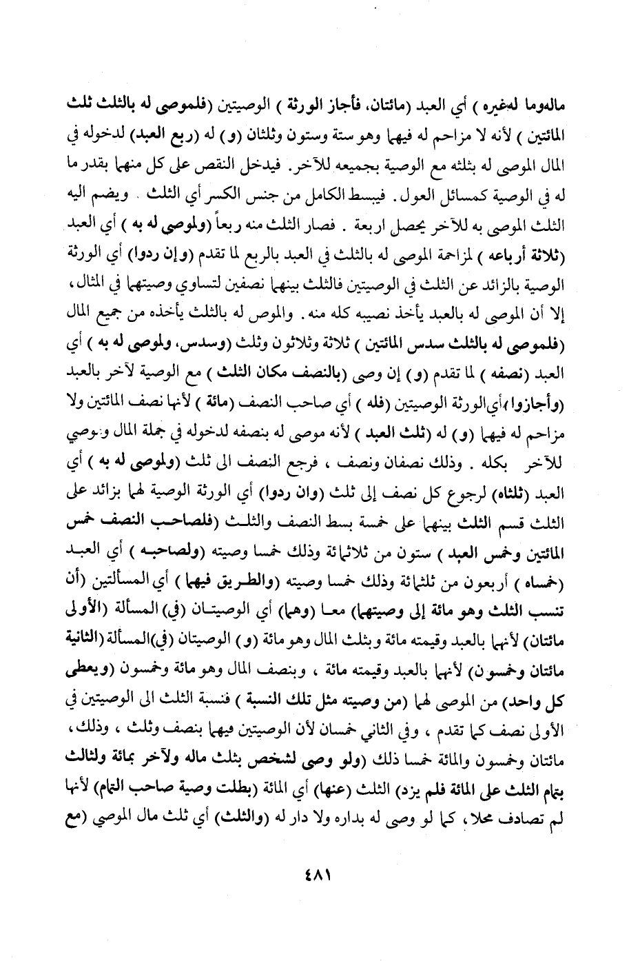 مَالِهِ وَمَالُهُ غَيْرُهُ) أَيْ الْعَبْدِ (مِائَتَانِ، فَأَجَازَ الْوَرَثَةُ) الْوَصِيَّتَيْنِ (فَلِمُوصًى لَهُ بِالثُّلُثِ ثُلُثُ الْمِائَتَيْنِ) لِأَنَّهُ لَا مُزَاحِمَ لَهُ فِيهِمَا وَهُوَ سِتَّةٌ وَسِتُّونَ وَثُلُثَانِ (وَ) لَهُ (رُبْعُ الْعَبْدِ) لِدُخُولِهِ فِي الْمَالِ الْمُوصَى لَهُ بِثُلُثِهِ مَعَ الْوَصِيَّةِ بِجَمِيعِهِ لِلْآخَرِ. فَيَدْخُلُ النَّقْصُ عَلَى كُلٍّ مِنْهُمَا بِقَدْرِ مَا لَهُ فِي الْوَصِيَّةِ كَمَسَائِلِ الْعَوْلِ. فَيَبْسُطُ الْكَامِلَ مِنْ جِنْسِ الْكَسْرِ أَيْ الثُّلُث. وَيَضُمُّ إلَيْهِ الثُّلُثَ الْمُوصَى بِهِ لِلْآخَرِ يَحْصُلُ أَرْبَعَةً. فَصَارَ الثُّلُثُ مِنْهُ رُبْعًا (وَلِمُوصًى لَهُ بِهِ) أَيْ الْعَبْدِ (ثَلَاثَةُ أَرْبَاعِهِ) لِمُزَاحَمَةِ الْمُوصَى لَهُ بِالثُّلُثِ فِي الْعَبْدِ بِالرُّبْعِ لِمَا تَقَدَّمَ (وَإِنْ رَدُّوا) أَيْ الْوَرَثَةُ الْوَصِيَّةَ بِالزَّائِدِ عَنْ الثُّلُثِ فِي الْوَصِيَّتَيْنِ فَالثُّلُثُ بَيْنَهُمَا نِصْفَيْنِ لِتَسَاوِي وَصِيَّتِهِمَا فِي الْمِثَالِ، إلَّا أَنَّ الْمُوصَى لَهُ بِالْعَبْدِ يَأْخُذُ نَصِيبَهُ كُلَّهُ مِنْهُ. وَالْمُوصَ لَهُ بِالثُّلُثِ يَأْخُذُهُ مِنْ جَمِيعِ الْمَالِ (فَلِمُوصًى لَهُ بِالثُّلُثِ سُدُسُ الْمِائَتَيْنِ) ثَلَاثَةٌ وَثَلَاثُونَ وَثُلُثٌ (وَسُدُسٌ، وَلِمُوصًى لَهُ بِهِ) أَيْ الْعَبْدِ (نِصْفُهُ) لِمَا تَقَدَّمَ (و) إنْ وَصَّى (بِالنِّصْفِ مَكَانَ الثُّلُثِ) مَعَ الْوَصِيَّةِ لِآخَرَ بِالْعَبْدِ (وَأَجَازُوا) أَيْ الْوَرَثَةُ الْوَصِيَّتَيْنِ (فَلَهُ) أَيْ صَاحِبِ النِّصْفِ (مِائَةٌ) لِأَنَّهَا نِصْفُ الْمِائَتَيْنِ وَلَا مُزَاحِمَ لَهُ فِيهِمَا.