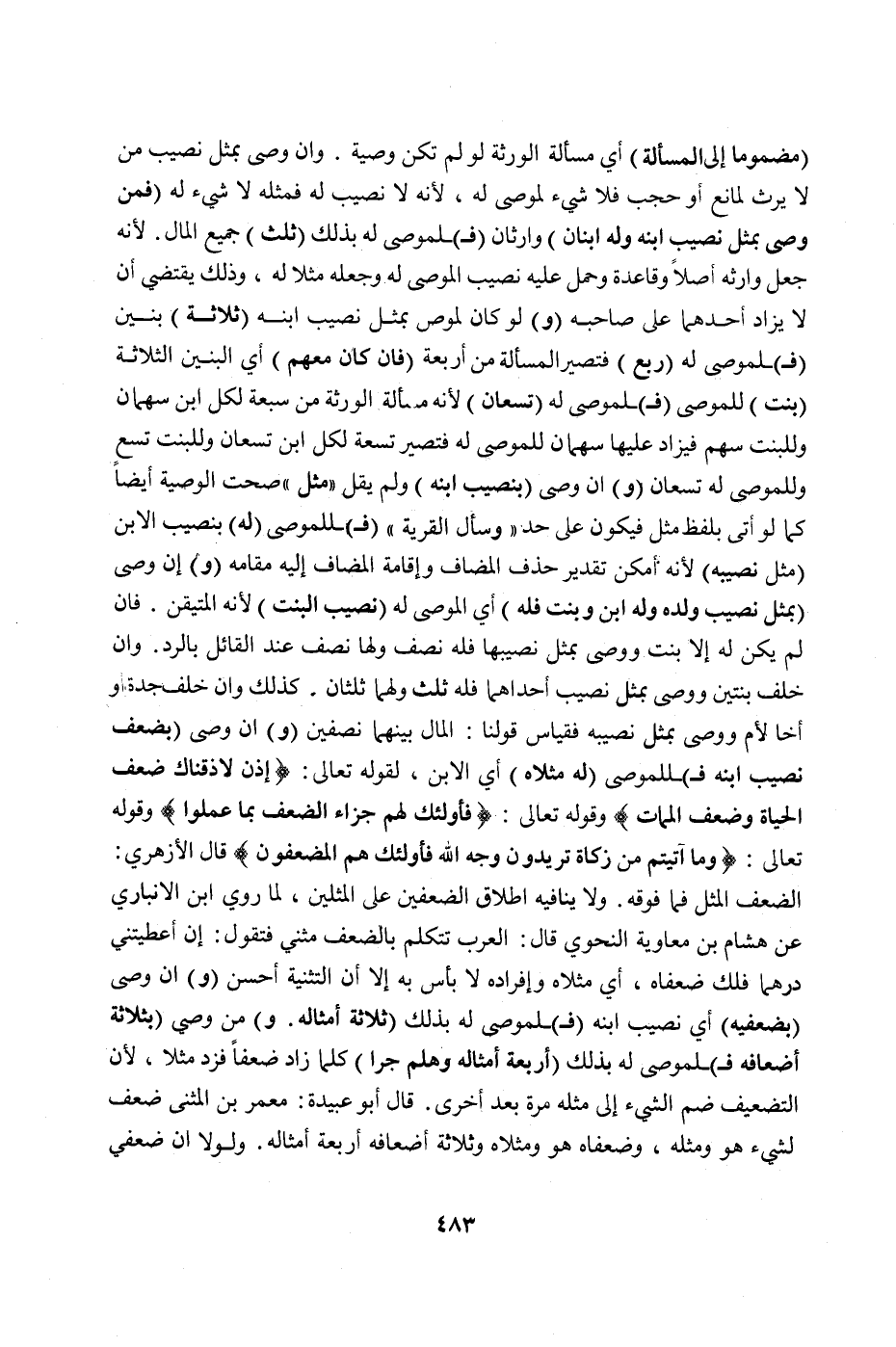 قَالَ الْأَزْهَرِيُّ: الضِّعْفُ الْمِثْلُ فَمَا فَوْقَهُ. وَلَا يُنَافِيهِ إطْلَاقُ الضِّعْفَيْنِ عَلَى الْمِثْلَيْنِ، لِمَا رَوَى ابْنُ الْأَنْبَارِيِّ عَنْ هِشَامِ بْنِ مُعَاوِيَةَ النَّحْوِيِّ قَالَ: الْعَرَبُ تَتَكَلَّمُ بِالضِّعْفِ مَثْنَى فَتَقُولُ: إنْ أَعْطَيْتَنِي دِرْهَمًا فَلَكَ ضِعْفَاهُ، أَيْ مِثْلَاهُ وَإِفْرَادُهُ لَا بَأْسَ بِهِ إلَّا أَنَّ التَّثْنِيَةَ أَحْسَنُ (و) إنْ وَصَّى (بِضِعْفَيْهِ) أَيْ نَصِيبِ ابْنِهِ (ف) لِمُوصًى لَهُ بِذَلِكَ (ثَلَاثَةُ أَمْثَالِهِ و) مَنْ وَصَّى (بِثَلَاثَةِ أَضْعَافِهِ ف) لِمُوصًى لَهُ بِذَلِكَ (أَرْبَعَةُ أَمْثَالِهِ وَهَلُمَّ جَرًّا) كُلَّمَا زَادَ ضِعْفًا فَزِدْ مِثْلًا، لِأَنَّ التَّضْعِيفَ ضَمُّ الشَّيْءِ إلَى مِثْلِهِ مَرَّةً بَعْدَ أُخْرَى.