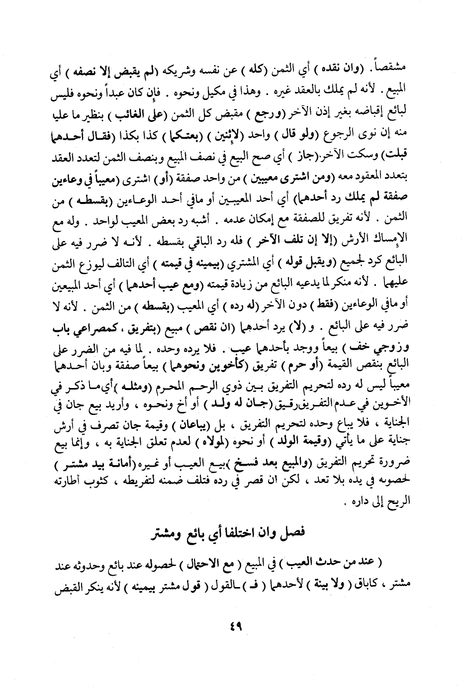 مُشَقَّصًا. (وَإِنْ نَقَدَهُ) أَيْ الثَّمَنَ (كُلَّهُ) عَنْ نَفْسِهِ وَشَرِيكِهِ (لَمْ يَقْبِضْ إلَّا نِصْفَهُ) أَيْ الْمَبِيعِ ; لِأَنَّهُ لَمْ يَمْلِكْ بِالْعَقْدِ غَيْرَهُ وَهَذَا فِي مَكِيلٍ وَنَحْوِهِ فَإِنْ كَانَ عَبْدًا وَنَحْوَهُ فَلَيْسَ لِبَائِعٍ إقْبَاضُهُ بِغَيْرِ إذْنِ الْآخَرِ (وَرَجَعَ) مُقْبِضُ كُلِّ الثَّمَنِ (عَلَى الْغَائِبِ) بِنَظِيرِ مَا عَلَيْهِ مِنْهُ إنْ نَوَى الرُّجُوعَ.