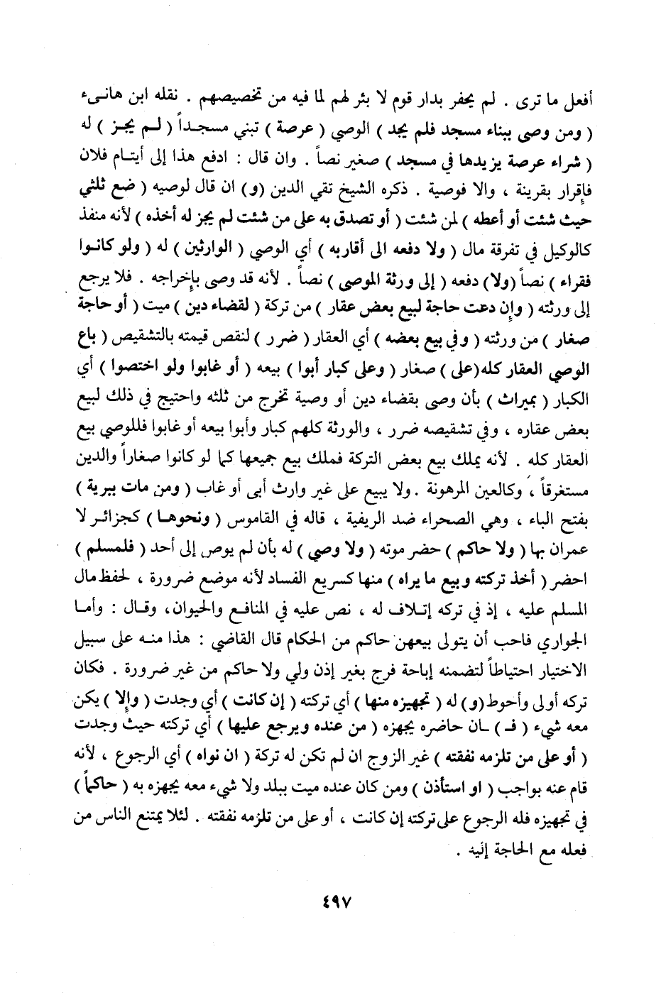 افْعَلْ مَا تَرَى لَمْ يَحْفِرْ بِدَارِ قَوْمٍ لَا بِئْرَ لَهُمْ لِمَا فِيهِ مِنْ تَخْصِيصِهِمْ نَقَلَهُ ابْنُ هَانِئٍ (وَمَنْ وَصَّى بِبِنَاءِ مَسْجِدٍ فَلَمْ يَجِدْ) الْوَصِيُّ (عَرْصَةً) تَبْنِي مَسْجِدًا (لَمْ يَجُزْ) لَهُ (شِرَاءُ عَرْصَةٍ يَزِيدُهَا فِي مَسْجِدٍ) صَغِيرٍ نَصًّا.