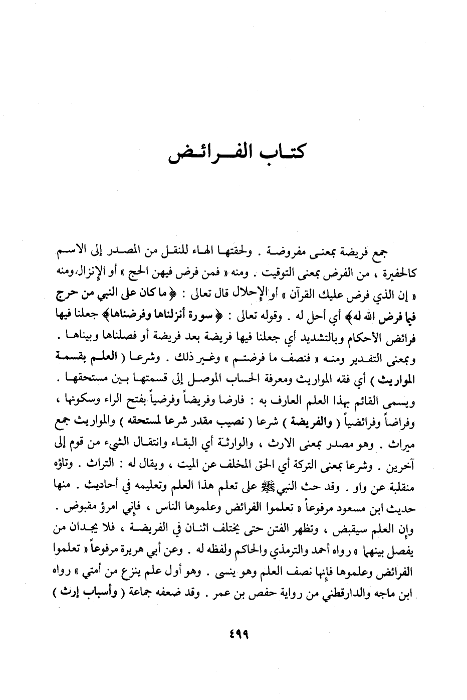 (كِتَابُ الْفَرَائِضِ) جَمْعُ فَرِيضَةٍ بِمَعْنَى مَفْرُوضَةٌ. وَلَحِقَتْهَا الْهَاءُ لِلنَّقْلِ مِنْ الْمَصْدَرِ إلَى الِاسْمِ كَالْحَفِيرَةِ، مِنْ الْفَرْضِ بِمَعْنَى التَّوْقِيتِ. وَمِنْهُ {فَمَنْ فَرَضَ فِيهِنَّ الْحَجَّ} [البقرة: ١٩٧] أَوْ الْإِنْزَالِ وَمِنْهُ {إنَّ الَّذِي فَرَضَ عَلَيْك الْقُرْآنَ} [القصص: ٨٥] أَوْ الْإِحْلَالِ قَالَ تَعَالَى {مَا كَانَ عَلَى النَّبِيِّ مِنْ حَرَجٍ فِيمَا فَرَضَ اللَّهُ لَهُ} [الأحزاب: ٣٨] أَيْ أَحَلَّ لَهُ. وقَوْله تَعَالَى {سُورَةٌ أَنْزَلْنَاهَا وَفَرَضْنَاهَا} [النور: ١] جَعَلْنَا فِيهَا فَرَائِضَ الْأَحْكَامِ وَبِالتَّشْدِيدِ أَيْ جَعَلْنَا فِيهَا فَرِيضَةً بَعْدَ فَرِيضَةٍ أَوْ فَصَّلْنَاهَا وَبَيِّنَاهَا وَبِمَعْنَى التَّقْدِيرِ وَمِنْهُ {فَنِصْفُ مَا فَرَضْتُمْ} [البقرة: ٢٣٧] وَغَيْرُ ذَلِكَ وَشَرْعًا (الْعِلْمُ بِقِسْمَةِ الْمَوَارِيثِ) أَيْ فِقْهِ الْمَوَارِيثِ وَمَعْرِفَةِ الْحِسَابِ الْمُوَصِّلِ إلَى قِسْمَتِهَا بَيْنَ مُسْتَحِقِّهَا. وَيُسَمَّى الْقَائِمُ بِهَذَا الْعِلْمِ الْعَارِفُ بِهِ فَارِضًا وَفَرِيضًا وَفَرْضِيًّا بِفَتْحِ الرَّاءِ وَسُكُونِهَا، وَفَرَّاضًا وَفَرَائِضِيًّا (وَالْفَرِيضَةُ) شَرْعًا (نَصِيبٌ مُقَدَّرٌ شَرْعًا لِمُسْتَحِقِّهِ) وَالْمَوَارِيثُ جَمْعُ مِيرَاثٍ. وَهُوَ مَصْدَرٌ بِمَعْنَى الْإِرْثِ، وَالْوِرَاثَةِ أَيْ الْبَقَاءِ وَانْتِقَالِ الشَّيْءِ مِنْ قَوْمٍ إلَى آخَرِينَ. وَشَرْعًا بِمَعْنَى التَّرِكَةِ أَيْ الْحَقِّ الْمُخَلَّفِ عَنْ الْمَيِّتِ، وَيُقَالُ لَهُ التُّرَاثُ. وَتَاؤُهُ مُنْقَلِبَةٌ عَنْ وَاوٍ. وَقَدْ حَثَّ النَّبِيُّ صَلَّى اللَّهُ عَلَيْهِ وَسَلَّمَ عَلَى تَعَلُّمِ هَذَا الْعِلْمِ وَتَعْلِيمِهِ فِي أَحَادِيثَ. مِنْهَا حَدِيثُ ابْنِ مَسْعُودٍ مَرْفُوعًا «تَعَلَّمُوا الْفَرَائِضَ وَعَلِّمُوهَا النَّاسَ، فَإِنِّي امْرُؤٌ مَقْبُوضٌ. وَإِنَّ الْعِلْمَ سَيُقْبَضُ، وَتَظْهَرُ الْفِتَنُ حَتَّى يَخْتَلِفَ اثْنَانِ فِي الْفَرِيضَةِ، فَلَا يَجِدَانِ مَنْ يَفْصِلُ بَيْنَهُمَا» رَوَاهُ أَحْمَدُ وَالتِّرْمِذِيُّ وَالْحَاكِمُ وَلَفْظُهُ لَهُ. وَعَنْ أَبِي هُرَيْرَةَ مَرْفُوعًا «تَعَلَّمُوا الْفَرَائِضَ وَعَلِّمُوهَا فَإِنَّهَا نِصْفُ الْعِلْمِ وَهُوَ يُنْسَى. وَهُوَ أَوَّلُ عِلْمٍ يُنْزَعُ مِنْ أُمَّتِي» رَوَاهُ ابْنُ مَاجَهْ وَالدَّارَقُطْنِيّ مِنْ رِوَايَةِ حَفْصِ بْنِ عُمَرَ. وَقَدْ ضَعَّفَهُ جَمَاعَةٌ