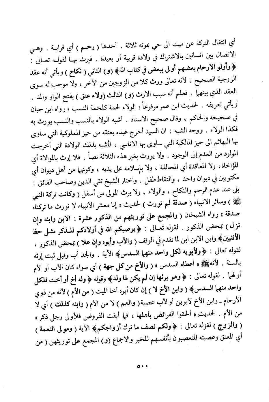 أَيْ انْتِقَالُ التَّرِكَةِ عَنْ مَيِّتٍ إلَى حَيٍّ بِمَوْتِهِ ثَلَاثَةٌ. أَحَدُهَا (رَحِمٌ) أَيْ قَرَابَةٌ. وَهِيَ الِاتِّصَالُ بَيْنَ إنْسَانَيْنِ بِالِاشْتِرَاكِ فِي وِلَادَةٍ قَرِيبَةٍ أَوْ بَعِيدَةٍ. فَيَرِثُ بِهَا لِقَوْلِهِ تَعَالَى: {وَأُولُو الْأَرْحَامِ بَعْضُهُمْ أَوْلَى بِبَعْضٍ فِي كِتَابِ اللَّهِ} [الأنفال: ٧٥] .