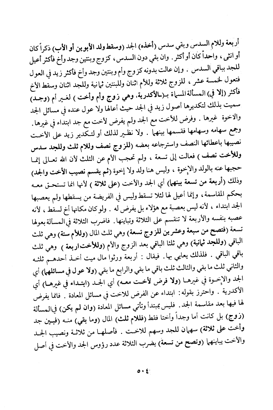 أَرْبِعَةٌ وَلِلْأُمِّ السُّدُسُ وَبَقِيَ سُدُسٌ (أَخَذَهُ) الْجَدُّ (وَسَقَطَ وَلَدُ الْأَبَوَيْنِ أَوْ الْأَبُ) ذَكَرًا كَانَ أَوْ أُنْثَى، وَاحِدًا كَانَ أَوْ أَكْثَرَ. وَإِنْ بَقِيَ دُونَ السُّدُسِ، كَزَوْجٍ وَبِنْتَيْنِ وَجَدٍّ وَأَخٍ فَأَكْثَرَ أُعِيلَ لِلْجَدِّ بِبَاقِي السُّدُسِ. وَإِنْ عَالَتْ بِدُونِهِ كَزَوْجٍ وَأُمٍّ وَبِنْتَيْنِ وَجَدٍّ وَأَخٍ فَأَكْثَرَ زِيدَ فِي الْعَوْلِ فَتَعُولُ لِخَمْسَةَ عَشَرَ، لِلزَّوْجِ ثَلَاثَةٌ وَلِلْأُمِّ اثْنَانِ وَلِلْبِنْتَيْنِ ثَمَانِيَةٌ وَلِلْجَدِّ اثْنَانِ وَسَقَطَ الْأَخُ فَأَكْثَرُ (إلَّا فِي) الْمَسْأَلَةِ الْمُسَمَّاةِ بِ (الْأَكْدَرِيَّةِ، وَهِيَ زَوْجٌ وَأُمٌّ وَأُخْتٌ) لِغَيْرِ أُمٍّ (وَجَدٍّ) سُمِّيَتْ بِذَلِكَ لِتَكْدِيرِهَا أُصُولَ زَيْدٌ فِي الْجَدِّ حَيْثُ أَعَالَهَا وَلَا عَوْلَ عِنْدَهُ فِي مَسَائِلِ الْجَدِّ، وَالْإِخْوَةِ وَغَيْرِهَا. وَفَرَضَ لِلْأُخْتِ مَعَ الْجَدِّ وَلَمْ يَفْرِضْ لِأُخْتٍ مَعَ جَدٍّ ابْتِدَاءً فِي غَيْرِهَا. وَجَمَعَ سِهَامَهُ وَسِهَامَهَا فَقَسَّمَهَا بَيْنَهُمَا. وَلَا نَظِيرَ لِذَلِكَ أَوْ لِتَكْدِيرِ زَيْدٍ عَلَى الْأُخْتِ نَصِيبَهَا بِإِعْطَائِهَا النِّصْفَ وَاسْتِرْجَاعِهِ بَعْضَهُ (لِلزَّوْجِ نِصْفٌ وَلِلْأُمِّ ثُلُثٌ وَلِلْجَدِّ سُدُسٌ وَلِلْأُخْتِ نِصْفٌ) فَعَالَتْ إلَى تِسْعَة، وَلَمْ تُحْجَبْ الْأُمُّ عَنْ الثُّلُثِ ; لِأَنَّ اللَّهَ تَعَالَى إنَّمَا حَجَبَهَا عَنْهُ بِالْوَلَدِ وَالْإِخْوَةِ، وَلَيْسَ هُنَا وَلَدٌ وَلَا إخْوَةٌ (ثُمَّ يُقَسَّمُ نَصِيبُ الْأُخْتِ وَالْجَدِّ) وَذَلِكَ (أَرْبَعَةً مِنْ تِسْعَةٍ بَيْنَهُمَا) أَيْ: الْجَدِّ وَالْأُخْتِ (عَلَى ثَلَاثَةٍ) ; لِأَنَّهَا إنَّمَا تَسْتَحِقُّ مَعَهُ بِحُكْمِ الْمُقَاسَمَةِ، وَإِنَّمَا أُعِيلَ لَهَا لِئَلَّا تَسْقُطَ وَلَيْسَ فِي الْفَرِيضَةِ مَنْ يُسْقِطُهَا وَلَمْ يَعْصِبْهَا الْجَدُّ ابْتِدَاءً ; لِأَنَّهُ لَيْسَ بِعَصَبَةٍ مَعَ هَؤُلَاءِ بَلْ يَفْرِضُ لَهُ. وَلَوْ كَانَ مَكَانَهَا أَخٌ لَسَقَطَ ; لِأَنَّهُ عَصَبَةٌ بِنَفْسِهِ وَالْأَرْبَعَةُ لَا تَنْقَسِمُ عَلَى الثَّلَاثَةِ وَتُبَايِنُهَا. فَاضْرِبْ الثَّلَاثَةَ فِي الْمَسْأَلَةِ بِعَوْلِهَا تِسْعَةٍ (فَتَصِحُّ مِنْ سَبْعَةٍ وَعِشْرِينَ لِلزَّوْجِ تِسْعَةٌ) وَهِيَ ثُلُثُ الْمَالِ (وَلِلْأُمِّ سِتَّة) وَهِيَ ثُلُثُ الْبَاقِي (وَلِلْجَدِّ ثَمَانِيَةٌ) وَهِيَ ثُلُثَا الْبَاقِي بَعْدَ الزَّوْجِ وَالْأُمِّ (وَلِلْأُخْتِ أَرْبَعَةٌ) وَهِيَ ثُلُثُ بَاقِي الْبَاقِي. فَلِذَلِكَ يُعَايَا بِهَا. فَيُقَالُ: أَرْبَعَةٌ وَرِثُوا مَالَ مَيِّتٍ أَخَذَ أَحَدُهُمْ ثُلُثَهُ وَالثَّانِي ثُلُثَ مَا بَقِيَ وَالثَّالِثُ ثُلُثَ بَاقِي مَا بَقِيَ وَالرَّابِعُ مَا بَقِيَ (وَلَا عَوْلَ فِي مَسَائِلِهِمَا) أَيْ: الْجَدِّ وَالْإِخْوَةِ فِي غَيْرِهَا (وَلَا فَرْضَ لِأُخْتٍ مَعَهُ) أَيْ: الْجَدِّ (ابْتِدَاءً فِي غَيْرِهَا) أَيْ: الْأَكْدَرِيَّةِ. وَاحْتَرَزَ بِقَوْلِهِ: ابْتِدَاءً عَنْ الْفَرْضِ لِلْأُخْتِ فِي مَسَائِلِ الْمُعَادَّةِ. فَإِنَّمَا يُفْرَضُ لَهَا فِيهَا بَعْدَ مُقَاسَمَةِ الْجَدِّ. فَلَيْسَ بِمُبْتَدَأٍ وَتَأْتِي مَسَائِلُ الْمُعَادَّةِ (وَإِنْ لَمْ يَكُنْ) فِي الْمَسْأَلَةِ (زَوْجٌ) بَلْ كَانَتْ أُمًّا وَجَدًّا وَأُخْتًا فَقَطْ (فَلِلْأُمِّ ثُلُثُ) الْمَالِ (وَمَا بَقِيَ) مِنْهُ (فَبَيْنَ جَدٍّ وَأُخْتٍ عَلَى ثَلَاثَةٍ) سَهْمَانِ لِلْجَدِّ وَسَهْمٌ لِلْأُخْتِ. فَأَصْلُهَا مِنْ ثَلَاثَةٍ وَنَصِيبُ الْجَدِّ وَالْأُخْتِ يُبَايِنُهُمَا (وَتَصِحُّ مِنْ تِسْعَةٍ) يُضْرَبُ الثَّلَاثَةُ عَدَدُ رُءُوسِ الْجَدِّ وَالْأُخْتِ فِي أَصْلِ