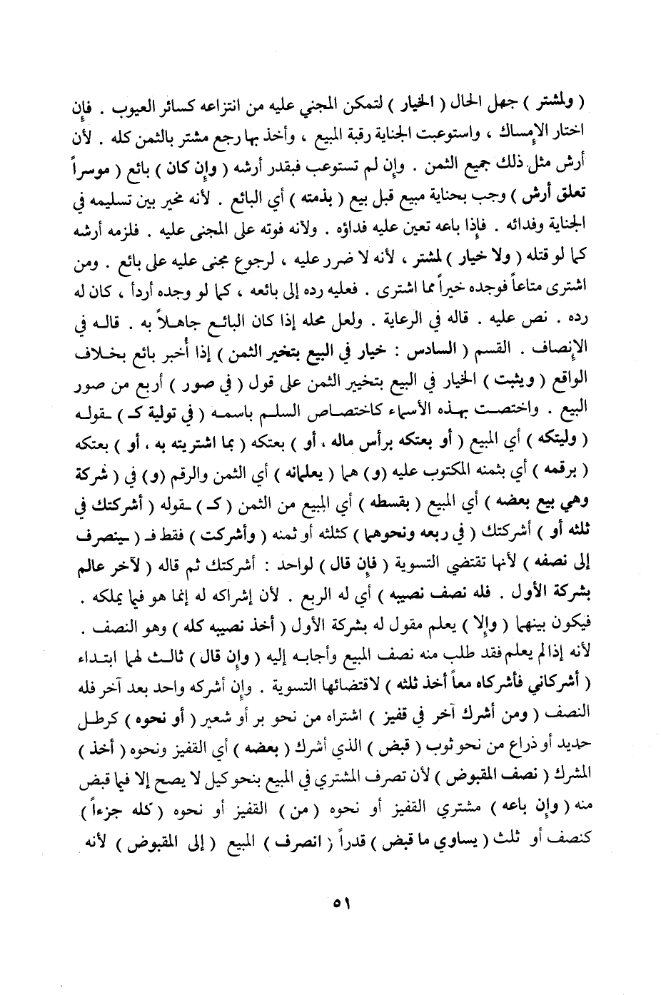 الْقِسْمُ (السَّادِسُ: خِيَارٌ فِي الْبَيْعِ بِتَخَيُّرِ الثَّمَنِ) إذَا أَخْبَرَ بَائِعٌ بِخِلَافِ الْوَاقِعِ (وَيَثْبُتُ) الْخِيَارُ فِي الْبَيْعِ بِتَخْيِيرِ الثَّمَنِ عَلَى قَوْلٍ (فِي صُوَرٍ) أَرْبَعٍ مِنْ صُوَرِ الْبَيْعِ وَاخْتُصَّتْ بِهَذِهِ الْأَسْمَاءِ كَاخْتِصَاصِ السَّلَمِ بِاسْمِهِ (فِي تَوْلِيَةٍ ك) قَوْلِهِ (وَلَّيْتُكَهُ) أَيْ الْمَبِيعَ (أَوْ بِعْتُكَهُ بِرَأْسِ مَالِهِ، أَوْ) بِعْتُكَهُ (بِمَا اشْتَرَيْتُهُ بِهِ، أَوْ) بِعْتُكَهُ (بِرَقْمِهِ) أَيْ بِثَمَنِهِ الْمَكْتُوبِ عَلَيْهِ (وَ) هُمَا (يَعْلَمَانِهِ) أَيْ الثَّمَنَ وَالرَّقْمَ (وَ) فِي (شَرِكَةٍ وَهِيَ بَيْعُ بَعْضِهِ) أَيْ الْمَبِيعِ (بِقِسْطِهِ) أَيْ الْمَبِيعِ مِنْ الثَّمَنِ (كَ) قَوْلِهِ (أَشْرَكْتُك فِي ثُلُثِهِ أَوْ) أَشْرَكْتُكَ (فِي رُبْعِهِ وَنَحْوِهِمَا) كَثُلُثِهِ أَوْ ثُمْنِهِ (وَأَشْرَكْتُ) فَقَطْ ف (يَنْصَرِفُ إلَى نِصْفِهِ) ; لِأَنَّهَا تَقْتَضِي التَّسْوِيَةَ.