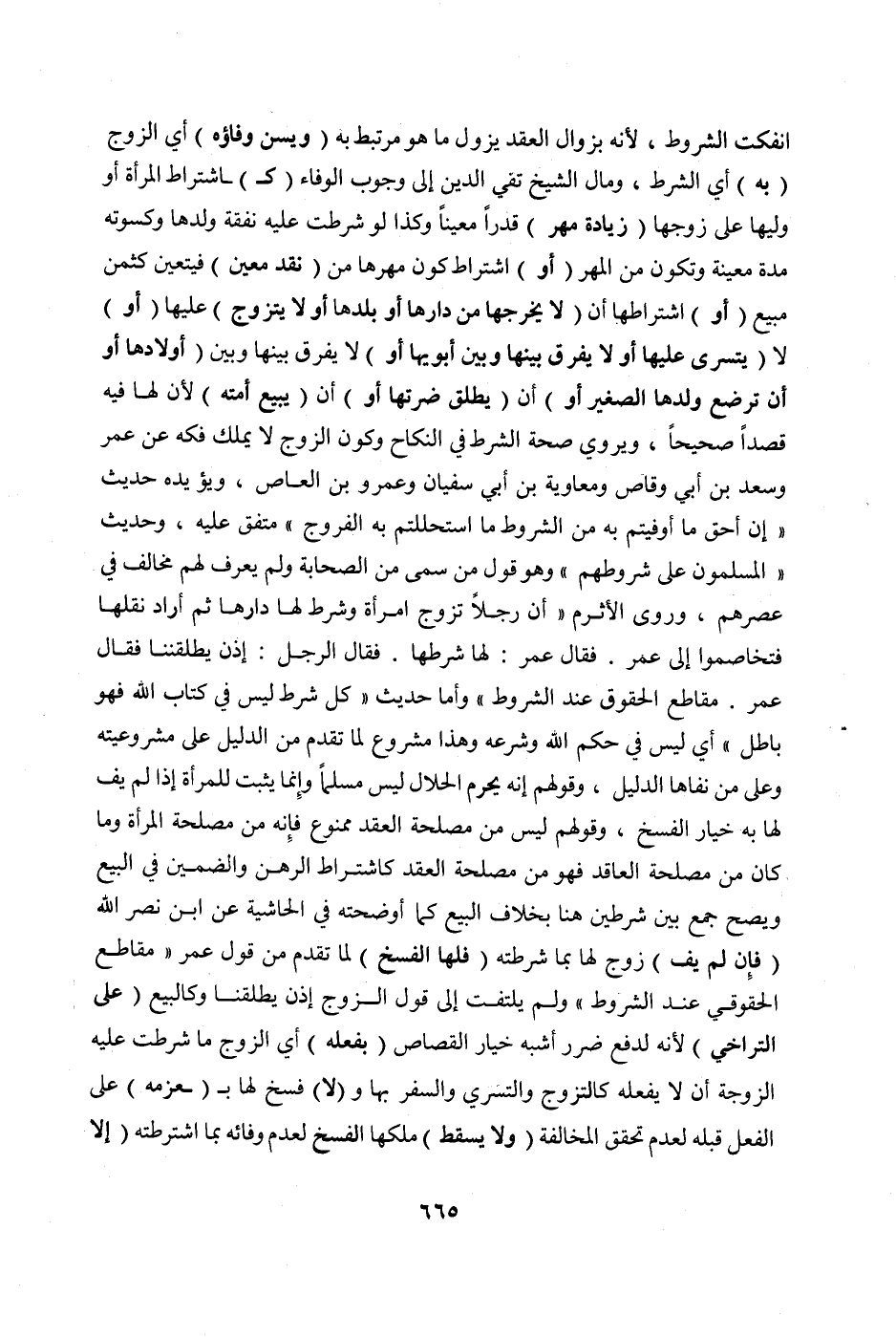 وَيُرْوَى صِحَّةُ الشَّرْطِ فِي النِّكَاحِ وَكَوْنُ الزَّوْجِ لَا يَمْلِكُ فَكَّهُ عَنْ عُمَرَ وَسَعْدِ بْنِ أَبِي وَقَّاصٍ وَمُعَاوِيَةَ بْنِ أَبِي سُفْيَانَ وَعَمْرِو بْنِ الْعَاصِ وَيُؤَيِّدُهُ حَدِيثُ «إنَّ أَحَقَّ مَا أَوْفَيْتُمْ بِهِ مِنْ الشُّرُوطِ مَا اسْتَحْلَلْتُمْ بِهِ الْفُرُوجَ» مُتَّفَقٌ عَلَيْهِ، وَحَدِيثُ «الْمُسْلِمُونَ عَلَى شُرُوطِهِمْ» وَهُوَ قَوْلُ مَنْ سُمِّيَ مِنْ الصَّحَابَةِ وَلَمْ يُعْرَفْ لَهُمْ مُخَالِفٌ فِي عَصْرِهِمْ، وَرَوَى الْأَثْرَمُ " أَنَّ رَجُلًا تَزَوَّجَ امْرَأَةً وَشَرَطَ لَهَا دَارَهَا ثُمَّ أَرَادَ نَقْلَهَا فَتَخَاصَمُوا إلَى عُمَرَ. فَقَالَ عُمَرُ: لَهَا شَرْطُهَا، فَقَالَ الرَّجُلُ: إذَنْ يُطَلِّقْنَنَا فَقَالَ عُمَرُ: مَقَاطِعُ الْحُقُوقِ عِنْدَ الشُّرُوطِ " وَأَمَّا حَدِيثُ «كُلُّ شَرْطٍ لَيْسَ فِي كِتَابِ اللَّهِ فَهُوَ بَاطِلٌ» أَيْ: لَيْسَ فِي حُكْمِ اللَّهِ وَشَرْعِهِ وَهَذَا مَشْرُوعٌ لِمَا تَقَدَّمَ مِنْ الدَّلِيلِ عَلَى مَشْرُوعِيَّتِهِ وَعَلَى مَنْ نَفَاهَا الدَّلِيلُ. وَقَوْلُهُمْ إنَّهُ يُحَرِّمُ الْحَلَالَ لَيْسَ مُسَلَّمًا وَإِنَّمَا يَثْبُتُ لِلْمَرْأَةِ إذَا لَمْ يَفِ لَهَا بِهِ خِيَارُ الْفَسْخِ، وَقَوْلُهُمْ لَيْسَ مِنْ مَصْلَحَةِ الْعَقْدِ مَمْنُوعٌ فَإِنَّهُ مِنْ مَصْلَحَةِ الْمَرْأَةِ وَمَا كَانَ مِنْ مَصْلَحَةِ الْعَاقِدِ فَهُوَ مِنْ مَصْلَحَةِ الْعَقْدِ كَاشْتِرَاطِ الرَّهْنِ وَالضَّمِينِ فِي الْبَيْعِ وَيَصِحُّ جَمْعٌ بَيْنَ شَرْطَيْنِ هُنَا بِخِلَافِ الْبَيْعِ كَمَا أَوْضَحْتُهُ فِي الْحَاشِيَةِ عَنْ ابْنِ نَصْرِ اللَّهِ.