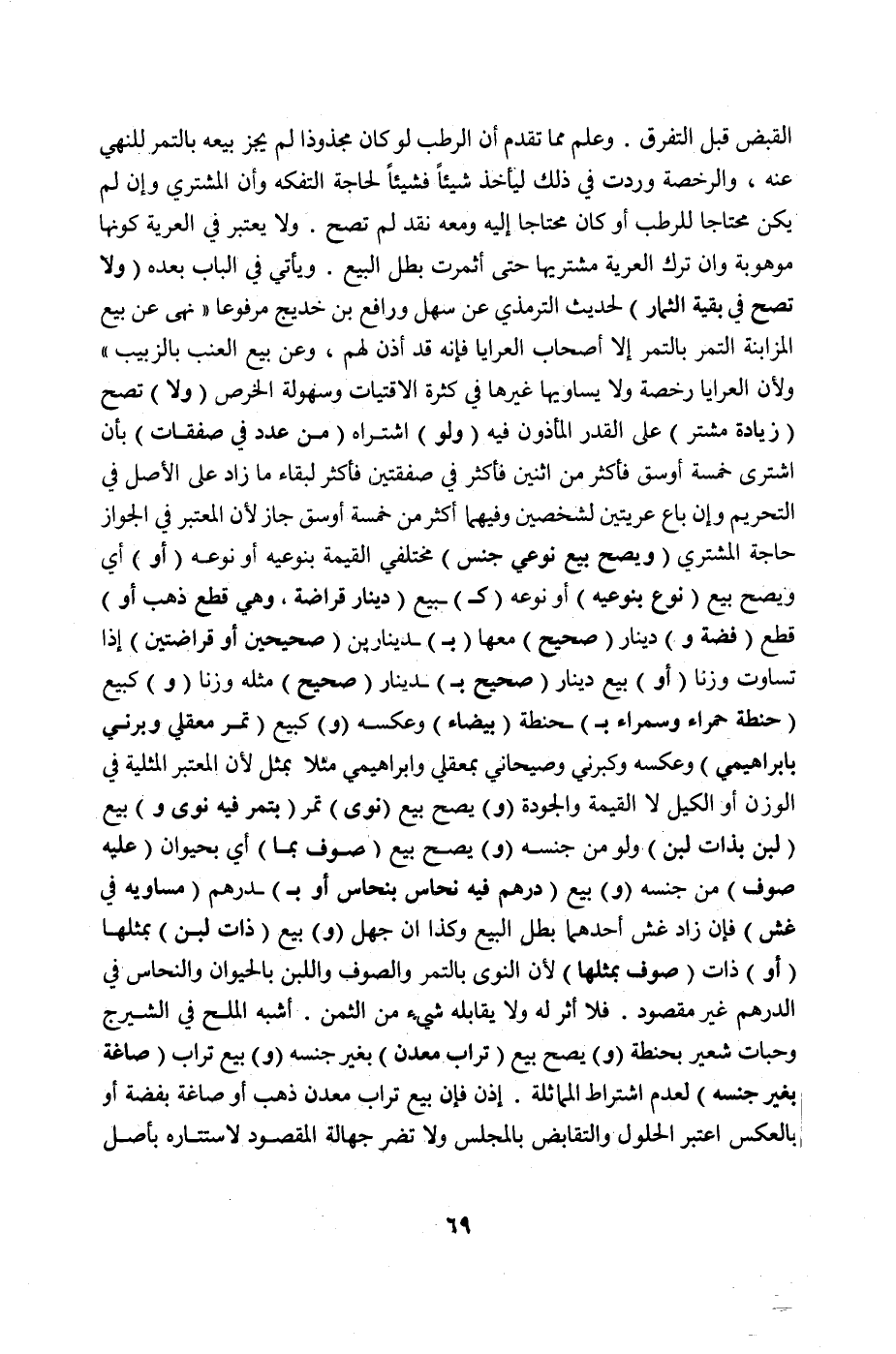 الْقَبْضِ قَبْلَ التَّفَرُّقِ وَعُلِمَ مِمَّا تَقَدَّمَ أَنَّ الرُّطَبَ لَوْ كَانَ مَجْذُوذًا لَمْ يَجُزْ بَيْعُهُ بِالتَّمْرِ لِلنَّهْيِ عَنْهُ، وَالرُّخْصَةُ وَرَدَتْ فِي ذَلِكَ لِيَأْخُذَ شَيْئًا فَشَيْئًا لِحَاجَةِ التَّفَكُّهِ وَأَنَّ الْمُشْتَرِيَ وَإِنْ لَمْ يَكُنْ مُحْتَاجًا لِلرُّطَبِ أَوْ كَانَ مُحْتَاجًا إلَيْهِ وَمَعَهُ نَقْدٌ لَمْ تَصِحَّ وَلَا يُعْتَبَرُ فِي الْعَرِيَّةِ كَوْنُهَا مَوْهُوبَةً وَإِنْ تَرَكَ الْعَرِيَّةَ مُشْتَرِيهَا حَتَّى أَثْمَرَتْ بَطَلَ الْبَيْعُ وَيَأْتِي فِي الْبَابِ بَعْدَهُ (وَلَا تَصِحُّ فِي بَقِيَّةِ الثِّمَارِ) لِحَدِيثِ التِّرْمِذِيِّ عَنْ سَهْلٍ وَرَافِعِ بْنِ خَدِيجٍ مَرْفُوعًا «نَهَى عَنْ بَيْعِ الْمُزَابَنَةِ التَّمْرِ بِالتَّمْرِ إلَّا أَصْحَابَ الْعَرَايَا فَإِنَّهُ قَدْ أَذِنَ لَهُمْ، وَعَنْ بَيْعِ الْعِنَبِ بِالزَّبِيبِ» وَلِأَنَّ الْعَرَايَا رُخْصَةٌ وَلَا يُسَاوِيهَا غَيْرُهَا فِي كَثْرَةِ الِاقْتِيَاتِ وَسُهُولَةِ الْخَرْصِ (وَلَا) تَصِحُّ (زِيَادَةُ مُشْتَرٍ) عَلَى الْقَدْرِ الْمَأْذُونِ فِيهِ (وَلَوْ) اشْتَرَاهُ (مِنْ عَدَدٍ فِي صَفَقَاتٍ) بِأَنْ اشْتَرَى خَمْسَةَ أَوْسُقٍ فَأَكْثَرَ مِنْ اثْنَيْنِ فَأَكْثَرَ فِي صَفْقَتَيْنِ فَأَكْثَرَ لِبَقَاءِ مَا زَادَ عَلَى الْأَصْلِ فِي التَّحْرِيمِ وَإِنْ بَاعَ عَرِيَّتَيْنِ لِشَخْصَيْنِ وَفِيهِمَا أَكْثَرُ مِنْ خَمْسَةِ أَوْسُقٍ جَازَ ; لِأَنَّ الْمُعْتَبَرَ فِي الْجَوَازِ حَاجَةُ الْمُشْتَرِي