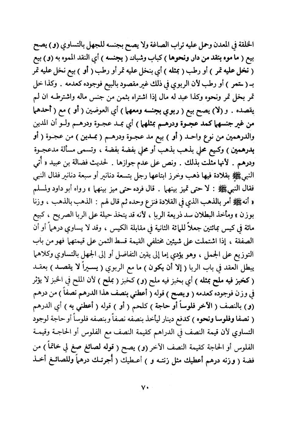 وَ (لَا) يَصِحُّ بَيْعُ (رِبَوِيٍّ بِجِنْسِهِ وَمَعَهُمَا) أَيْ الْعِوَضَيْنِ (أَوْ) مَعَ (أَحَدِهِمَا مِنْ غَيْرِ جِنْسِهِمَا كَمُدِّ عَجْوَةٍ وَدِرْهَمٍ بِمِثْلِهِمَا) أَيْ بِمُدِّ عَجْوَةٍ وَدِرْهَمٍ وَلَوْ أَنَّ الْمُدَّيْنِ وَالدِّرْهَمَيْنِ مِنْ نَوْعٍ وَاحِدٍ (أَوْ) بَيْعُ مُدِّ عَجْوَةٍ وَدِرْهَمٍ (بِمُدَّيْنِ) مِنْ عَجْوَةٍ (أَوْ بِدِرْهَمَيْنِ) وَكَبَيْعِ مُحَلًّى بِذَهَبٍ بِذَهَبٍ أَوْ مُحَلًّى بِفِضَّةٍ بِفِضَّةٍ، وَتُسَمَّى مَسْأَلَةُ مُدِّ عَجْوَةٍ وَدِرْهَمٍ ; لِأَنَّهَا مُثِّلَتْ بِذَلِكَ وَنُصَّ عَلَى عَدَمِ جَوَازِهَا لِحَدِيثِ فَضَالَةَ بْنِ عُبَيْدٍ «أُتِيَ النَّبِيُّ صَلَّى اللَّهُ عَلَيْهِ وَسَلَّمَ بِقِلَادَةٍ فِيهَا ذَهَبٌ وَخَرَزٌ ابْتَاعَهَا رَجُلٌ بِتِسْعَةِ دَنَانِيرَ أَوْ سَبْعَةِ دَنَانِيرَ فَقَالَ النَّبِيُّ صَلَّى اللَّهُ عَلَيْهِ وَسَلَّمَ: لَا حَتَّى تُمَيِّزَ بَيْنَهُمَا قَالَ فَرَدَّهُ حَتَّى مَيَّزَ بَيْنَهُمَا» . رَوَاهُ أَبُو دَاوُد وَلِمُسْلِمٍ «أَنَّهُ صَلَّى اللَّهُ عَلَيْهِ وَسَلَّمَ أَمَرَ بِالذَّهَبِ الَّذِي فِي الْقِلَادَةِ فَنُزِعَ وَحْدَهُ ثُمَّ قَالَ لَهُمْ: الذَّهَبُ بِالذَّهَبِ، وَزْنًا بِوَزْنٍ»