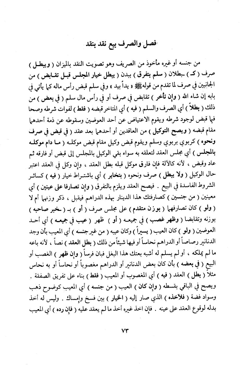 ٍ مِنْ جِنْسِهِ أَوْ غَيْرِهِ مَأْخُوذٌ مِنْ الصَّرِيفِ وَهُوَ تَصْوِيتُ النَّقْدِ بِالْمِيزَانِ (وَيَبْطُلُ) صَرْفٌ (كَ) بُطْلَانِ (سَلَمٍ بِتَفَرُّقٍ) بِبَدَنٍ (يَبْطُلُ خِيَارُ الْمَجْلِسِ قَبْلَ تَقَابُضٍ) مِنْ الْجَانِبَيْنِ فِي صَرْفٍ لِمَا تَقَدَّمَ مِنْ قَوْلِهِ صَلَّى اللَّهُ عَلَيْهِ وَسَلَّمَ «يَدًا بِيَدٍ» وَفِي سَلَمٍ قُبِضَ رَأْسُ مَالِهِ كَمَا يَأْتِي فِي بَابِهِ إنْ شَاءَ اللَّهُ