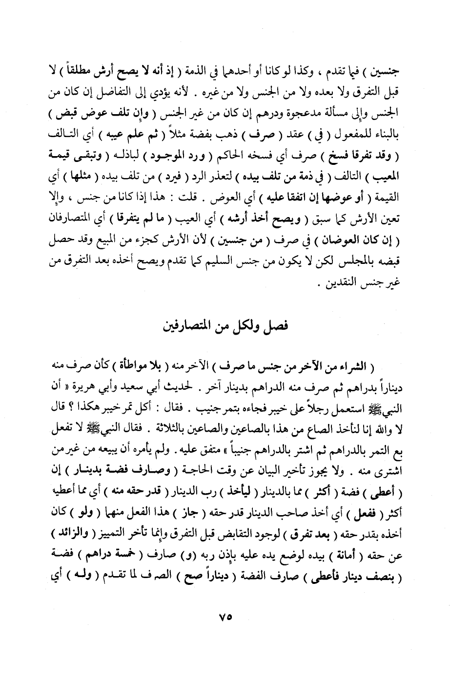 فَصْلٌ وَلِكُلٍّ مِنْ الْمُتَصَارِفَيْنِ (الشِّرَاءُ مِنْ الْآخَرِ مِنْ جِنْسِ مَا صَرَفَ) الْآخَرُ مِنْهُ (بِلَا مُوَاطَأَةٍ) كَأَنْ صَرَفَ مِنْهُ دِينَارًا بِدَرَاهِمَ ثُمَّ صَرَفَ مِنْهُ الدَّرَاهِمَ بِدِينَارٍ آخَرَ لِحَدِيثِ أَبِي سَعِيدٍ وَأَبِي هُرَيْرَةَ «أَنَّ النَّبِيَّ صَلَّى اللَّهُ عَلَيْهِ وَسَلَّمَ اسْتَعْمَلَ رَجُلًا عَلَى خَيْبَرَ فَجَاءَهُ بِتَمْرٍ جَنِيبٍ فَقَالَ: أَكُلُّ تَمْرِ خَيْبَر هَكَذَا؟ قَالَ لَا وَاَللَّهِ إنَّا لَنَأْخُذُ الصَّاعَ مِنْ هَذَا بِالصَّاعَيْنِ وَالصَّاعَيْنِ بِالثَّلَاثَةِ فَقَالَ النَّبِيُّ صَلَّى اللَّهُ عَلَيْهِ وَسَلَّمَ لَا تَفْعَلْ بِعْ التَّمْرَ بِالدَّرَاهِمِ ثُمَّ اشْتَرِ بِالدَّرَاهِمِ جَنِيبًا» مُتَّفَقٌ عَلَيْهِ وَلَمْ يَأْمُرْهُ أَنْ يَبِيعَهُ مِنْ غَيْرِ مَنْ اشْتَرَى مِنْهُ وَلَا يَجُوزُ تَأْخِيرُ الْبَيَانِ عَنْ وَقْتِ الْحَاجَةِ