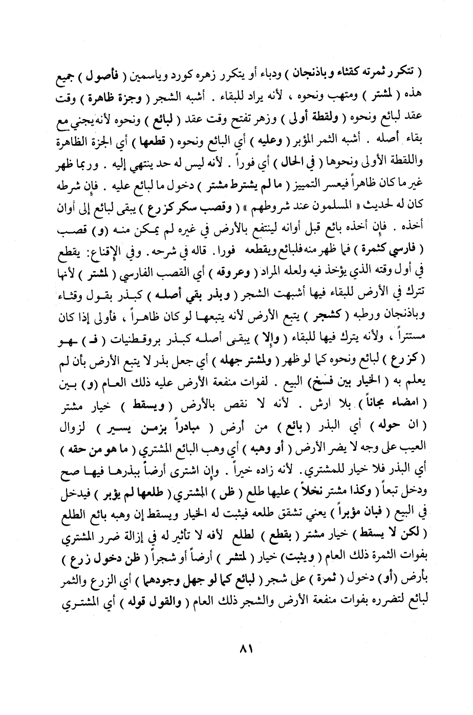وَفِي الْإِقْنَاعِ: يُقْطَعُ فِي أَوَّلِ وَقْتِهِ الَّذِي يُؤْخَذُ فِيهِ وَلَعَلَّهُ الْمُرَادُ (وَعُرُوقُهُ) أَيْ الْقَصَبُ الْفَارِسِيُّ (لِمُشْتَرٍ) ; لِأَنَّهَا تُتْرَكُ فِي الْأَرْضِ لِلْبَقَاءِ فِيهَا أَشْبَهَتْ الشَّجَرَ (وَبَذْرٌ بَقِيَ أَصْلُهُ) كَبَذْرِ بُقُولٍ وَقِثَّاءٍ وَبَاذِنْجَانٍ وَرَطْبِهِ (كَشَجَرٍ) يَتْبَعُ الْأَرْضَ ; لِأَنَّهُ يَتْبَعُهَا لَوْ كَانَ ظَاهِرًا، فَأَوْلَى إذَا كَانَ مُسْتَتِرًا، وَلِأَنَّهُ يُتْرَكُ فِيهَا لِلْبَقَاءِ (وَإِلَّا) يَبْقَى أَصْلُهُ كَبَذْرِ بُرٍّ وَقِطْنِيَّاتٍ (فَ) هُوَ (كَزَرْعٍ) لِبَائِعٍ وَنَحْوِهِ كَمَا لَوْ ظَهَرَ (وَلِمُشْتَرٍ جَهِلَهُ) أَيْ جَعْلَ بَذْرٍ لَا يَتْبَعُ الْأَرْضَ بِأَنْ لَمْ يَعْلَمْ بِهِ (الْخِيَارُ بَيْنَ فَسْخِ) الْبَيْعِ لِفَوَاتِ مَنْفَعَةِ الْأَرْضِ عَلَيْهِ ذَلِكَ الْعَامَ.