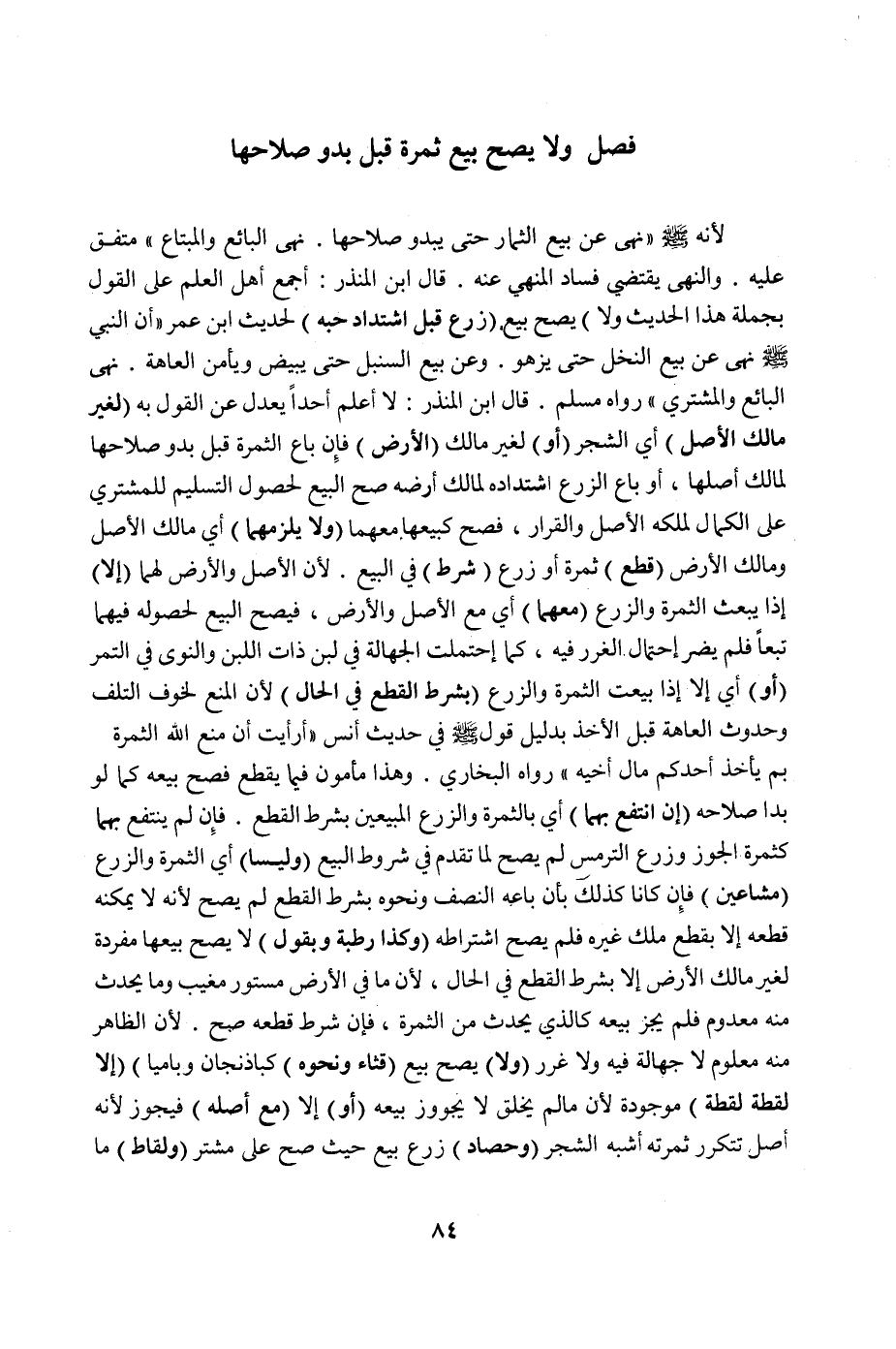 قَالَ ابْنُ الْمُنْذِرِ: أَجْمَعَ أَهْلُ الْعِلْمِ عَلَى الْقَوْلِ بِجُمْلَةِ هَذَا الْحَدِيثِ (وَلَا) يَصِحُّ بَيْعُ (زَرْعٍ قَبْلَ اشْتِدَادِ حَبِّهِ) لِحَدِيثِ ابْنِ عُمَرَ " أَنَّ النَّبِيَّ صَلَّى اللَّهُ عَلَيْهِ وَسَلَّمَ «نَهَى عَنْ بَيْعِ النَّخْلِ حَتَّى يَزْهُوَ وَعَنْ بَيْعِ السُّنْبُلِ حَتَّى يَبْيَضَّ وَيَأْمَنَ الْعَاهَةَ نَهَى الْبَائِعَ وَالْمُشْتَرِيَ» رَوَاهُ مُسْلِمٌ.