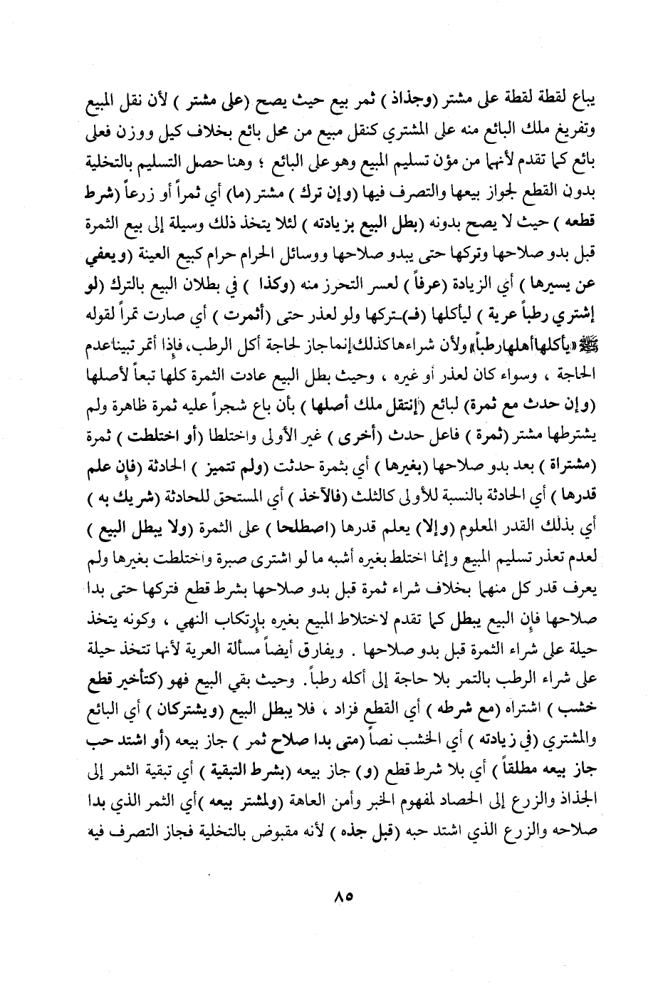 (وَإِنْ حَدَثَ مَعَ ثَمَرَةٍ) لِبَائِعٍ (انْتَقَلَ مِلْكُ أَصْلِهَا) بِأَنْ بَاعَ شَجَرًا عَلَيْهِ ثَمَرَةٌ ظَاهِرَةٌ وَلَمْ يَشْتَرِطْهَا مُشْتَرٍ (ثَمَرَةٌ) فَاعِلُ حَدَثَ (أُخْرَى) غَيْرُ الْأُولَى وَاخْتَلَطَا (أَوْ اخْتَلَطَتْ) ثَمَرَةٌ (مُشْتَرَاةٌ) بَعْدَ بُدُوِّ صَلَاحِهَا (بِغَيْرِهَا) أَيْ بِثَمَرَةٍ حَدَثَتْ (وَلَمْ تَتَمَيَّزْ) الْحَادِثَةُ (فَإِنْ عُلِمَ قَدْرُهَا) أَيْ الْحَادِثَةِ بِالنِّسْبَةِ لِلْأُولَى كَالثُّلُثِ (فَالْآخِذُ) أَيْ الْمُسْتَحِقُّ لِلْحَادِثَةِ (شَرِيكٌ بِهِ) أَيْ بِذَلِكَ الْقَدْرِ الْمَعْلُومِ (وَإِلَّا) يُعْلَمْ قَدْرُهَا (اصْطَلَحَا) عَلَى الثَّمَرَةِ.