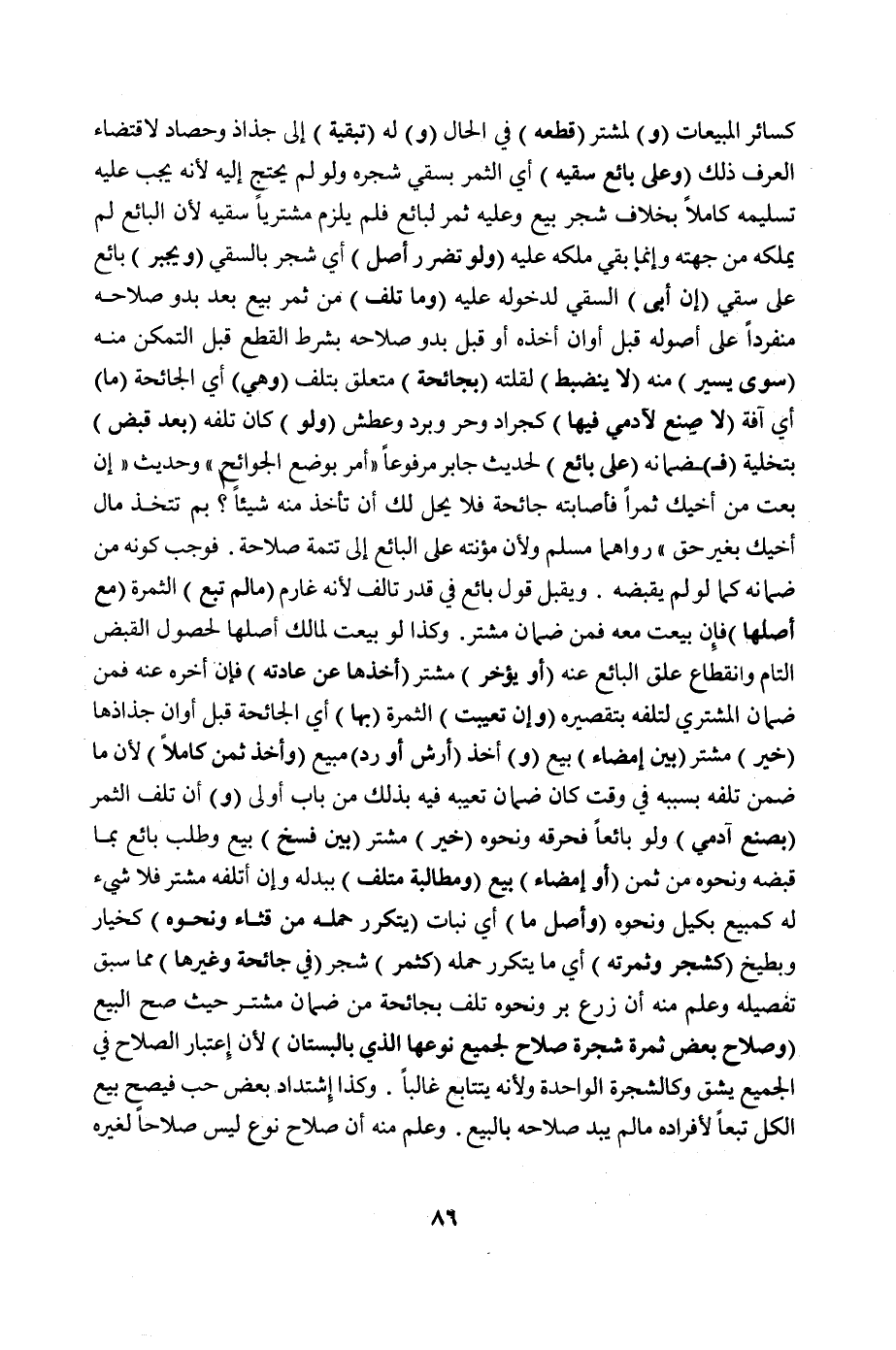 (وَلَوْ تَضَرَّرَ أَصْلٌ) أَيْ شَجَرٌ بِالسَّقْيِ (وَيُجْبَرُ) بَائِعٌ عَلَى سَقْيٍ (إنْ أَبَى) السَّقْيَ لِدُخُولِهِ عَلَيْهِ (وَمَا تَلِفَ) مِنْ ثَمَرٍ بِيعَ بَعْدَ بُدُوِّ صَلَاحِهِ مُنْفَرِدًا عَلَى أُصُولِهِ قَبْلَ أَوَانِ أَخْذِهِ أَوْ قَبْلَ بُدُوِّ صَلَاحِهِ بِشَرْطِ الْقَطْعِ قَبْلَ التَّمَكُّنِ مِنْهُ (سِوَى يَسِيرٍ) مِنْهُ (لَا يَنْضَبِطُ) لِقِلَّتِهِ (بِجَائِحَةٍ) مُتَعَلِّقٌ بِتَلَفِ (وَهِيَ) أَيْ الْجَائِحَةُ (مَا) أَيْ آفَةٌ (لَا صُنْعَ لِآدَمِيٍّ فِيهَا) كَجَرَادٍ وَحَرٍّ وَبَرْدٍ وَعَطَشٍ