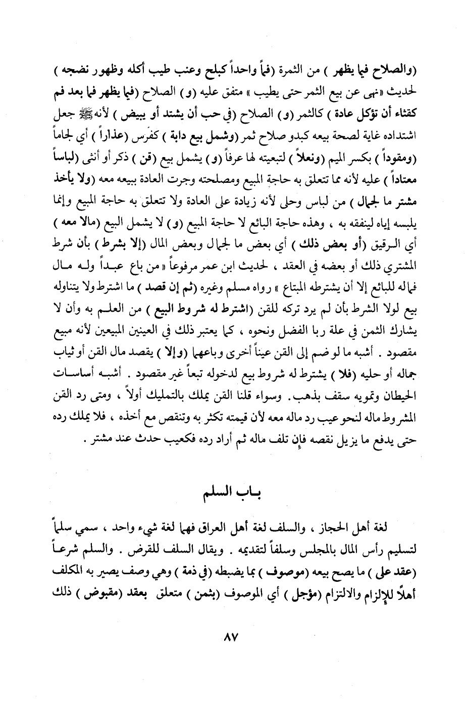 ِ لُغَةُ أَهْلِ الْحِجَازِ، وَالسَّلَفُ لُغَةُ أَهْلِ الْعِرَاقِ فَهُمَا لُغَةً شَيْءٌ وَاحِدٌ، سُمِّيَ سَلَمًا لِتَسْلِيمِ رَأْسِ الْمَالِ بِالْمَجْلِسِ وَسَلَفًا لِتَقْدِيمِهِ وَيُقَالُ السَّلَفُ لِلْقَرْضِ وَالسَّلَمُ شَرْعًا (عَقْدٌ عَلَى) مَا يَصِحُّ بَيْعُهُ (مَوْصُوفٌ) بِمَا يَضْبِطُهُ (فِي ذِمَّةٍ) وَهِيَ وَصْفٌ يَصِيرُ بِهِ الْمُكَلَّفُ أَهْلًا لِلْإِلْزَامِ وَالِالْتِزَامِ (مُؤَجَّلٌ) أَيْ الْمَوْصُوفُ (بِثَمَنٍ) مُتَعَلِّقٍ بِ " عَقْدِ " (مَقْبُوضِ) ذَلِكَ