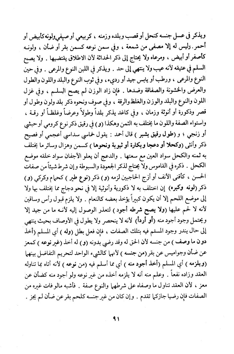 وَيَذْكُرُ فِي عَسَلٍ جِنْسَهُ كَنَحْلٍ أَوْ قَصَبٍ وَبَلَدَهُ وَزَمَنَهُ، كَرَبِيعِيٍّ أَوْ صَيْفِيٍّ وَلَوْنَهُ كَأَبْيَضَ أَوْ أَحْمَرَ وَلَيْسَ لَهُ إلَّا مُصَفًّى مِنْ شَمْعَةٍ، وَفِي سَمْنٍ نَوْعَهُ كَسَمْنِ بَقَرٍ أَوْ ضَأْنٍ، وَلَوْنَهُ كَأَصْفَرَ أَوْ أَبْيَضَ، وَمَرْعَاهُ وَلَا يَحْتَاجُ إلَى ذِكْرِ الْحَدَاثَةِ ; لِأَنَّ الْإِطْلَاقَ يَقْتَضِيهَا وَلَا يَصِحُّ السَّلَمُ فِي عَتِيقِهِ ; لِأَنَّهُ عَيْبٌ وَلَا يَنْتَهِي إلَى حَدٍّ وَيَذْكُرُ فِي اللَّبَنِ النَّوْعَ وَالْمَرْعَى وَفِي حِينِ النَّوْعِ وَالْمَرْعَى، وَرَطْبٍ أَوْ يَابِسٍ جَيِّدٍ أَوْ رَدِيءٍ، وَفِي ثَوْبٍ النَّوْعَ وَالْبَلَدَ وَاللَّوْنَ وَالطُّولَ وَالْعَرْضَ وَالْخُشُونَةَ وَالصَّفَاقَةَ وَضِدَّهَا.