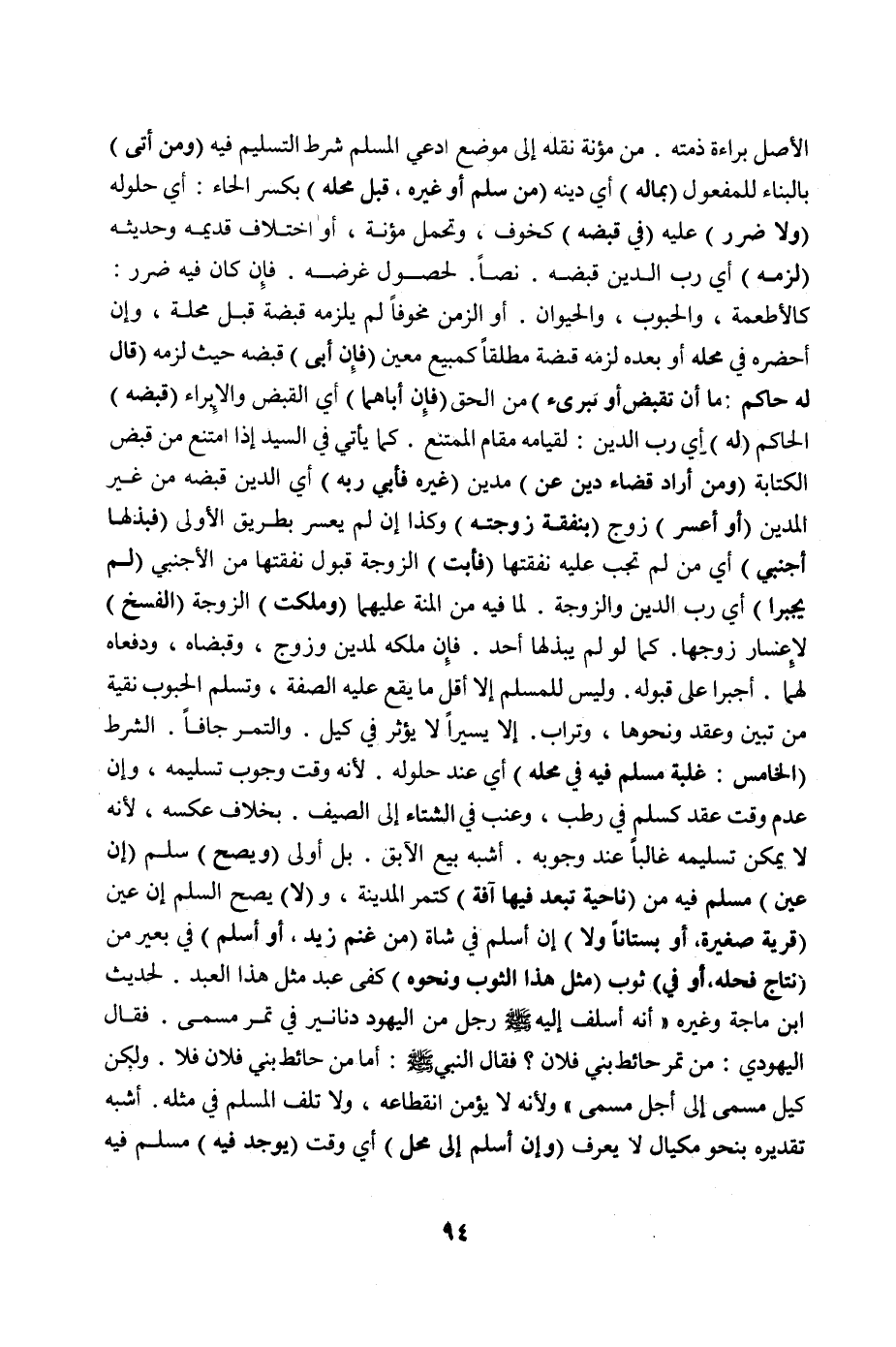 الشَّرْطُ (الْخَامِسُ: غَلَبَةُ مُسْلَمٍ فِيهِ فِي مَحِلِّهِ) أَيْ عِنْدَ حُلُولِهِ ; لِأَنَّهُ وَقْتُ وُجُوبِ تَسْلِيمِهِ، وَإِنْ عُدِمَ وَقْتَ عَقْدِ كَسَلَمٍ فِي رُطَبٍ، وَعِنَبٍ فِي الشِّتَاءِ إلَى الصَّيْفِ بِخِلَافِ عَكْسِهِ، لِأَنَّهُ لَا يُمْكِنُ تَسْلِيمُهُ غَالِبًا عِنْدَ وُجُوبِهِ أَشْبَهَ بَيْعَ الْآبِقِ بَلْ أَوْلَى. (وَيَصِحُّ) سَلَمٌ (إنْ عَيَّنَ) مُسْلَمٌ فِيهِ مِنْ (نَاحِيَةٍ تَبْعُدُ فِيهَا آفَةٌ) كَتَمْرِ الْمَدِينَةِ، و.