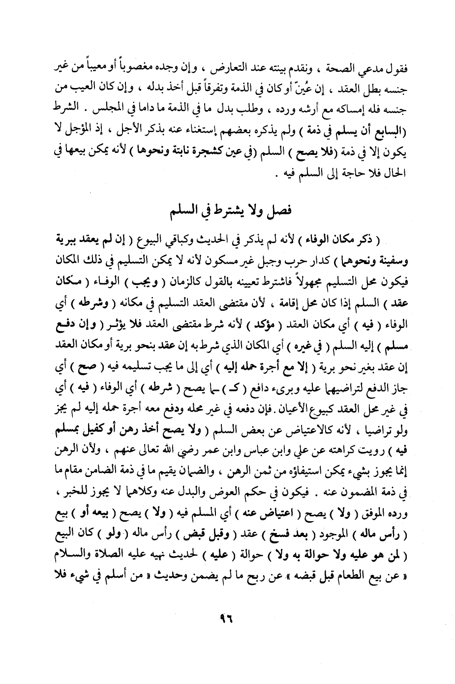 ِ) ; لِأَنَّهُ لَمْ يُذْكَرْ فِي الْحَدِيثِ وَكَبَاقِي الْبُيُوعِ (إنْ لَمْ يُعْقَدْ بِبَرِّيَّةٍ وَسَفِينَةٍ وَنَحْوِهِمَا) كَدَارِ حَرْبٍ وَجَبَلٍ غَيْرِ مَسْكُونٍ ; لِأَنَّهُ لَا يُمْكِنُ التَّسْلِيمُ فِي ذَلِكَ الْمَكَانِ فَيَكُونُ مَحِلُّ التَّسْلِيمِ مَجْهُولًا فَاشْتُرِطَ تَعْيِينُهُ بِالْقَوْلِ كَالزَّمَانِ (وَيَجِبُ) الْوَفَاءُ (مَكَانَ عَقْدِ) السَّلَمِ إذَا كَانَ مَحَلَّ إقَامَةٍ ; لِأَنَّ مُقْتَضَى الْعَقْدِ التَّسْلِيمُ فِي مَكَانِهِ