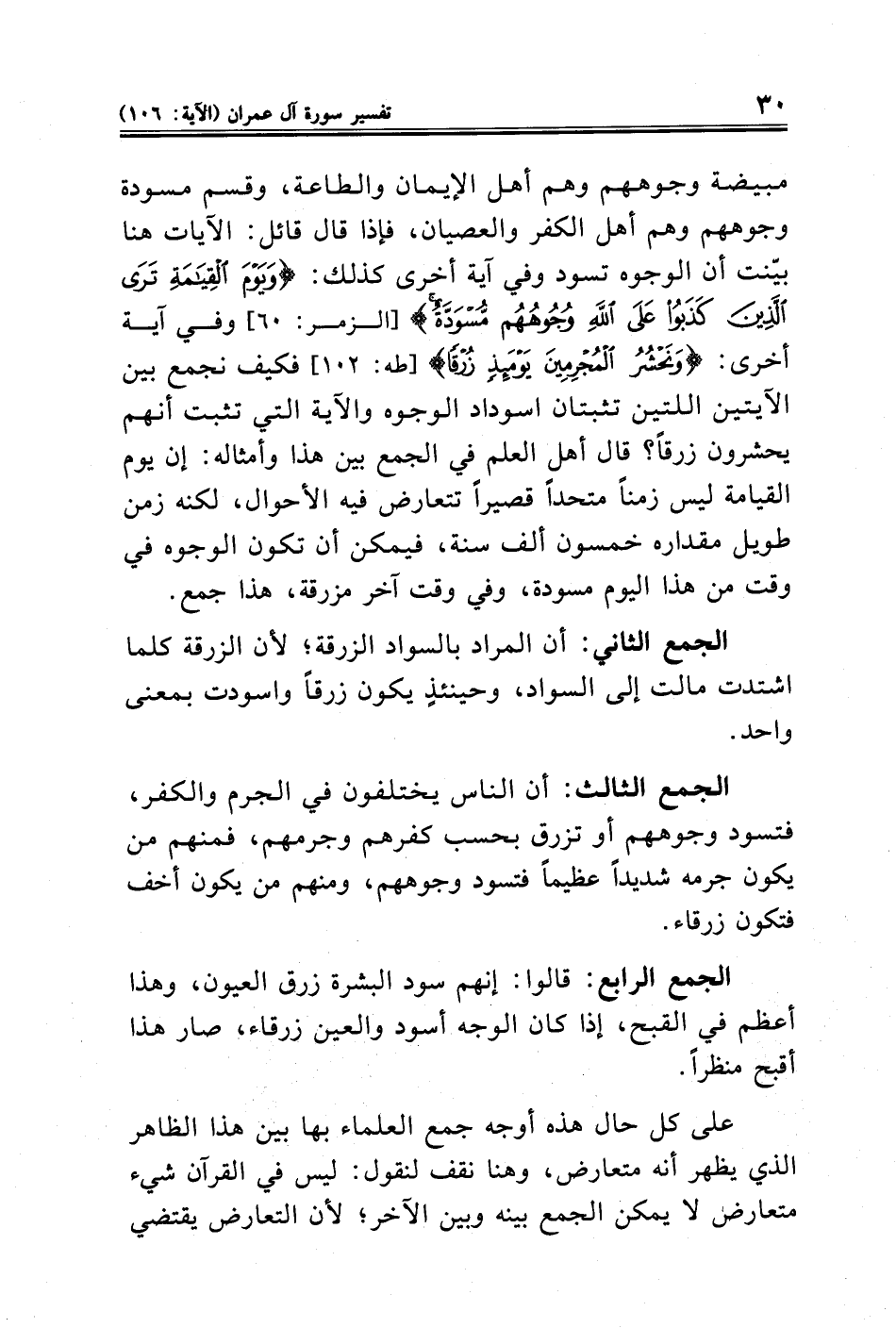 مبيضة وجوههم وهم أهل الإيمان والطاعة، وقسم مسودة وجوههم وهم أهل الكفر والعصيان، فإذا قال قائل: الآيات هنا بيّنت أن الوجوه تسود وفي آية أخرى كذلك: {وَيَوْمَ الْقِيَامَةِ تَرَى الَّذِينَ كَذَبُوا عَلَى اللَّهِ وُجُوهُهُمْ مُسْوَدَّةٌ} [الزمر: ٦٠] وفي آية أخرى: {وَنَحْشُرُ الْمُجْرِمِينَ يَوْمَئِذٍ زُرْقًا} [طه: ١٠٢] فكيف نجمع بين الآيتين اللتين تثبتان اسوداد الوجوه والآية التي تثبت أنهم يحشرون زرقًا؟ قال أهل العلم في الجمع بين هذا وأمثاله: إن يوم القيامة ليس زمنًا متحدًا قصيرًا تتعارض فيه الأحوال، لكنه زمن طويل مقداره خمسون ألف سنة، فيمكن أن تكون الوجوه في وقت من هذا اليوم مسودة، وفي وقت آخر مزرقة، هذا جمع.