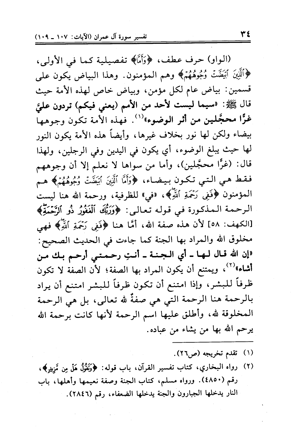 (الواو) حرف عطف، {وَأَمَّا} تفصيلية كما في الأولى، {الَّذِينَ ابْيَضَّتْ وُجُوهُهُمْ} وهم المؤمنون. وهذا البياض يكون على قسمين: بياض عام لكل مؤمن، وبياض خاص لهذه الأمة حيث قال - صلى الله عليه وسلم -: "سيما ليست لأحد من الأمم (يعني فيكم) تردون عليَّ غرًّا محجَّلين من أثر الوضوء" (¬١). فهذه الأمة تكون وجوهها بيضاء ولكن لها نور بخلاف غيرها، وأيضًا هذه الأمة يكون النور لها حيث يبلغ الوضوء، أي يكون في اليدين وفي الرجلين، ولهذا قال: (غرًّا محجَّلين)، وأما من سواها لا نعلم إلا أن وجوههم فقط هي التي تكون بيضاء، {وَأَمَّا الَّذِينَ ابْيَضَّتْ وُجُوهُهُمْ} هم المؤمنون {فَفِي رَحْمَةِ اللَّهِ}، "في" للظرفية، ورحمة الله هنا ليست الرحمة المذكورة في قوله تعالى: {وَرَبُّكَ الْغَفُورُ ذُو الرَّحْمَةِ} [الكهف: ٥٨] لأن هذه صفة الله، أمَّا هنا {فَفِي رَحْمَةِ اللَّهِ} فهي مخلوق الله والمراد بها الجنة كما جاءت في الحديث الصحيح: "إن الله قال لها -أي الجنة- أنتِ رحمتي أرحم بك من أشاء" (¬٢)، ويمتنع أن يكون المراد بها الصفة؛ لأن الصفة لا تكون ظرفًا للبشر، وإذا امتنع أن تكون ظرفًا للبشر امتنع أن يراد بالرحمة هنا الرحمة التي هي صفةٌ لله تعالى، بل هي الرحمة المخلوقة لله، وأطلق عليها اسم الرحمة لأنها كانت برحمة الله يرحم الله بها من يشاء من عباده.