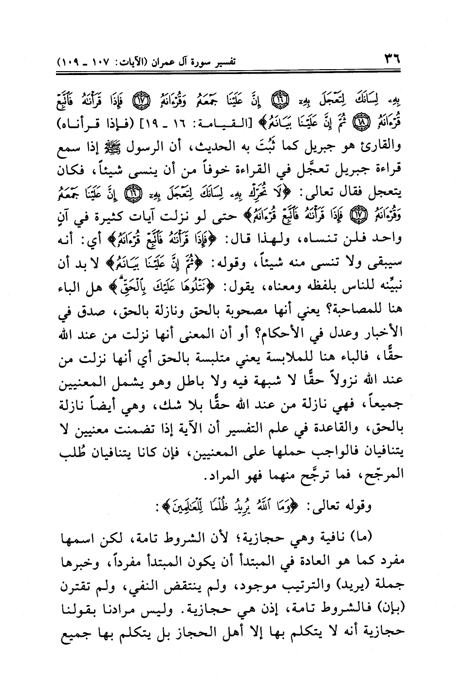 بِهِ لِسَانَكَ لِتَعْجَلَ بِهِ (١٦) إِنَّ عَلَيْنَا جَمْعَهُ وَقُرْآنَهُ (١٧) فَإِذَا قَرَأْنَاهُ فَاتَّبِعْ قُرْآنَهُ (١٨) ثُمَّ إِنَّ عَلَيْنَا بَيَانَهُ} [القيامة: ١٦ - ١٩] (فإذا قرأناه) والقارئ هو جبريل كما ثَبُتَ به الحديث، أن الرسول - صلى الله عليه وسلم - إذا سمع قراءة جبريل تعجَّل في القراءة خوفًا من أن ينسى شيئًا، فكان يتعجل فقال تعالى: {لَا تُحَرِّكْ بِهِ لِسَانَكَ لِتَعْجَلَ بِهِ (١٦) إِنَّ عَلَيْنَا جَمْعَهُ وَقُرْآنَهُ (١٧) فَإِذَا قَرَأْنَاهُ فَاتَّبِعْ قُرْآنَهُ} حتى لو نزلت آيات كثيرة في آنٍ واحد فلن تنساه، ولهذا قال: {فَإِذَا قَرَأْنَاهُ فَاتَّبِعْ قُرْآنَهُ} أي: أنه سيبقى ولا تنسى منه شيئًا، وقوله: {ثُمَّ إِنَّ عَلَيْنَا بَيَانَهُ} لابد أن نبيِّنه للناس بلفظه ومعناه، يقول: {نَتْلُوهَا عَلَيْكَ بِالْحَقِّ} هل الباء هنا للمصاحبة؟ يعني أنها مصحوبة بالحق ونازلة بالحق، صدق في الأخبار وعدل في الأحكام؟ أو أن المعنى أنها نزلت من عند الله حقًّا، فالباء هنا للملابسة يعني متلبسة بالحق أي أنها نزلت من عند الله نزولًا حقًّا لا شبهة فيه ولا باطل وهو يشمل المعنيين جميعًا، فهي نازلة من عند الله حقَّا بلا شك، وهي أيضًا نازلة بالحق، والقاعدة في علم التفسير أن الآية إذا تضمنت معنيين لا يتنافيان فالواجب حملها على المعنيين، فإن كانا يتنافيان طُلب المرجّح، فما ترجَّح منهما فهو المراد.