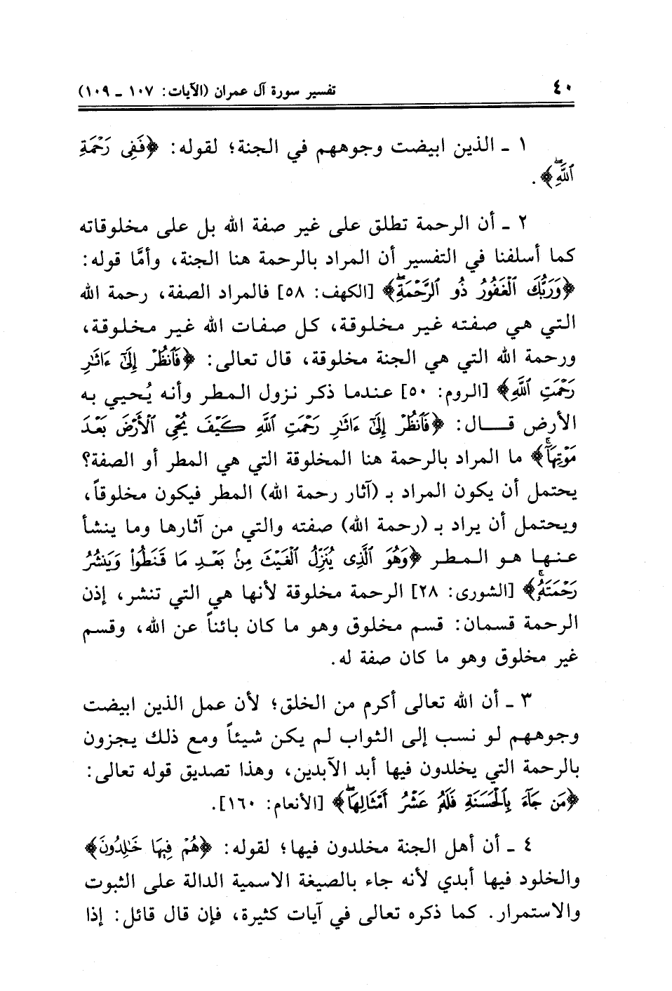 ٢ - أن الرحمة تطلق على غير صفة الله بل على مخلوقاته كما أسلفنا في التفسير أن المراد بالرحمة هنا الجنة، وأمَّا قوله: {وَرَبُّكَ الْغَفُورُ ذُو الرَّحْمَةِ} [الكهف: ٥٨] فالمراد الصفة، رحمة الله التي هي صفته غير مخلوقة، كل صفات الله غير مخلوقة، ورحمة الله التي هي الجنة مخلوقة، قال تعالى: {فَانْظُرْ إِلَى آثَارِ رَحْمَتِ اللَّهِ} [الروم: ٥٠] عندما ذكر نزول المطر وأنه يُحيي به الأرض قال: {فَانْظُرْ إِلَى آثَارِ رَحْمَتِ اللَّهِ كَيْفَ يُحْيِ الْأَرْضَ بَعْدَ مَوْتِهَا} ما المراد بالرحمة هنا المخلوقة التي هي المطر أو الصفة؟ يحتمل أن يكون المراد بـ (آثار رحمة الله) المطر فيكون مخلوقًا، ويحتمل أن يراد بـ (رحمة الله) صفته والتي من آثارها وما ينشأ عنها هو المطر {وَهُوَ الَّذِي يُنَزِّلُ الْغَيْثَ مِنْ بَعْدِ مَا قَنَطُوا وَيَنْشُرُ رَحْمَتَهُ} [الشورى: ٢٨] الرحمة مخلوقة لأنها هي التي تنشر، إذن الرحمة قسمان: قسم مخلوق وهو ما كان بائنًا عن الله، وقسم غير مخلوق وهو ما كان صفة له.