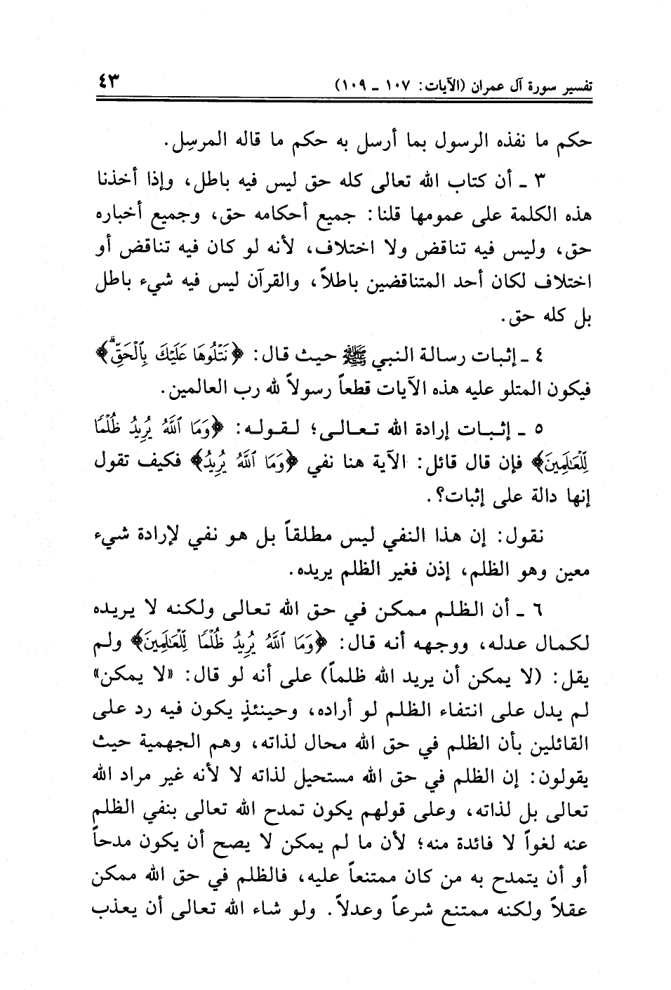 ٦ - أن الظلم ممكن في حق الله تعالى ولكنه لا يريده لكمال عدله، ووجهه أنه قال: {وَمَا اللَّهُ يُرِيدُ ظُلْمًا لِلْعَالَمِينَ} ولم يقل: (لا يمكن أن يريد الله ظلمًا) على أنه لو قال: "لا يمكن" لم يدل على انتفاء الظلم لو أراده، وحينئذٍ يكون فيه رد على القائلين بأن الظلم في حق الله محال لذاته، وهم الجهمية حيث يقولون: إن الظلم في حق الله مستحيل لذاته لا لأنه غير مراد الله تعالى بل لذاته، وعلى قولهم يكون تمدح الله تعالى بنفي الظلم عنه لغوًا لا فائدة منه؛ لأن ما لم يمكن لا يصح أن يكون مدحًا أو أن يتمدح به من كان ممتنعًا عليه، فالظلم في حق الله ممكن عقلًا ولكنه ممتنع شرعًا وعدلًا. ولو شاء الله تعالى أن يعذب