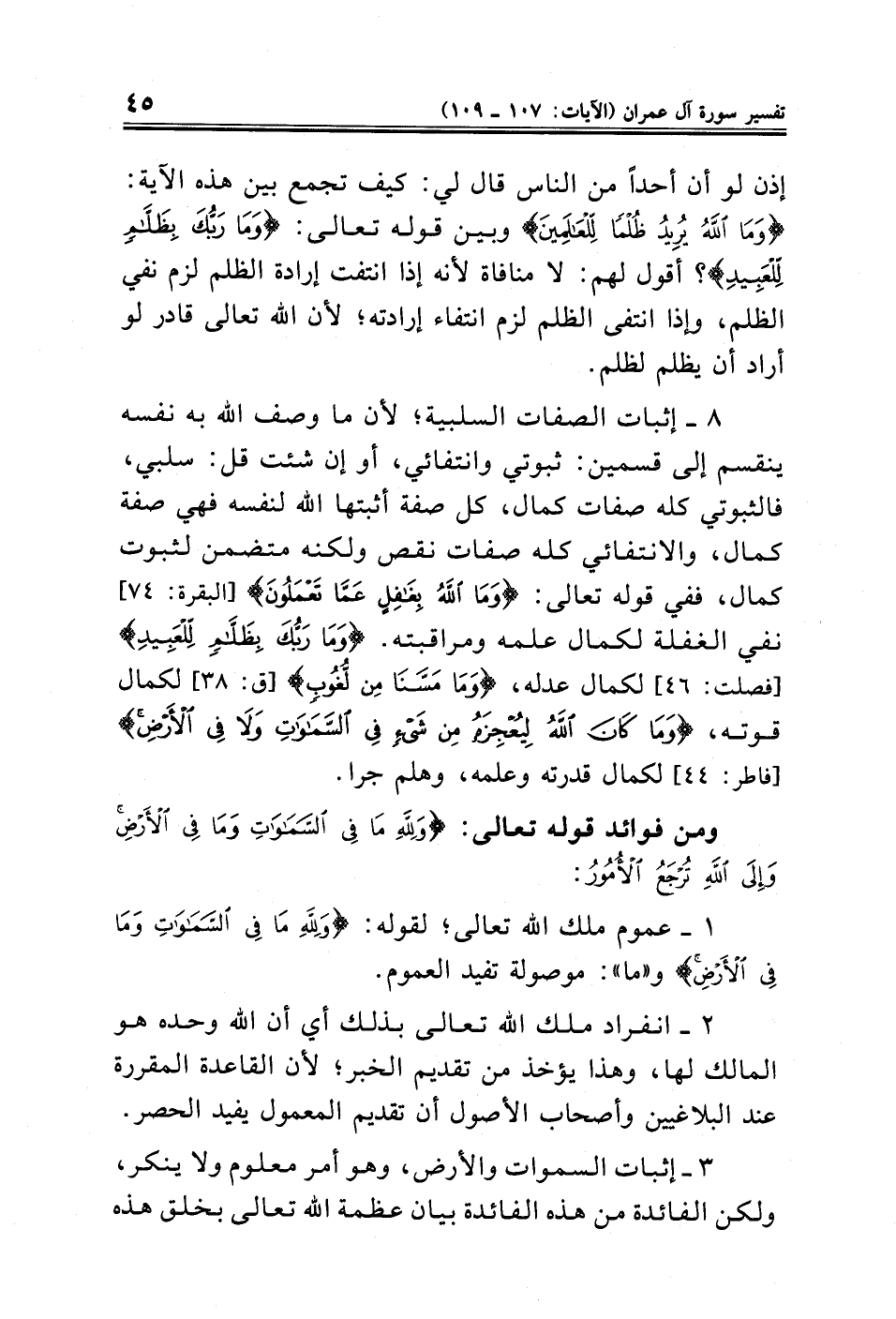 إذن لو أن أحدًا من الناس قال لي: كيف تجمع بين هذه الآية: {وَمَا اللَّهُ يُرِيدُ ظُلْمًا لِلْعَالَمِينَ} وبين قوله تعالى: {وَمَا رَبُّكَ بِظَلَّامٍ لِلْعَبِيدِ}؟ أقول لهم: لا منافاة لأنه إذا انتفت إرادة الظلم لزم نفي الظلم، وإذا انتفى الظلم لزم انتفاء إرادته؛ لأن الله تعالى قادر لو أراد أن يظلم لظلم.