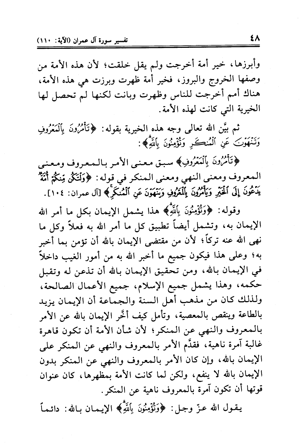 وقوله: {وَتُؤْمِنُونَ بِاللَّهِ} هذا يشمل الإيمان بكل ما أمر الله الإيمان به، وتشمل أيضًا تطبيق كل ما أمر الله به فعلًا وكل ما نهى الله عنه تركا؛ لأن من مقتضى الإيمان بالله أن تؤمن بما أخبر به؛ وعلى هذا فيكون جميع ما أخبر الله به من أمور الغيب داخلًا في الإيمان بالله، ومن تحقيق الإيمان بالله أن تذعن له وتقبل حكمه، وهذا يشمل جميع الإِسلام، جميع الأعمال الصالحة، ولذلك كان من مذهب أهل السنة والجماعة أن الإيمان يزيد بالطاعة وينقص بالمعصية، وتأمل كيف أخر الإيمان بالله عن الأمر بالمعروف والنهي عن المنكر؛ لأن شأن الأمة أن تكون قاهرة غالبة آمرة ناهية، فقدم الأمر بالمعروف والنهي عن المنكر على الإيمان بالله، وإن كان الأمر بالمعروف والنهي عن المنكر بدون الإيمان بالله لا ينفع، ولكن لما كانت الأمة بمظهرها، كان عنوان قوتها أن تكون آمرة بالمعروف ناهية عن المنكر.