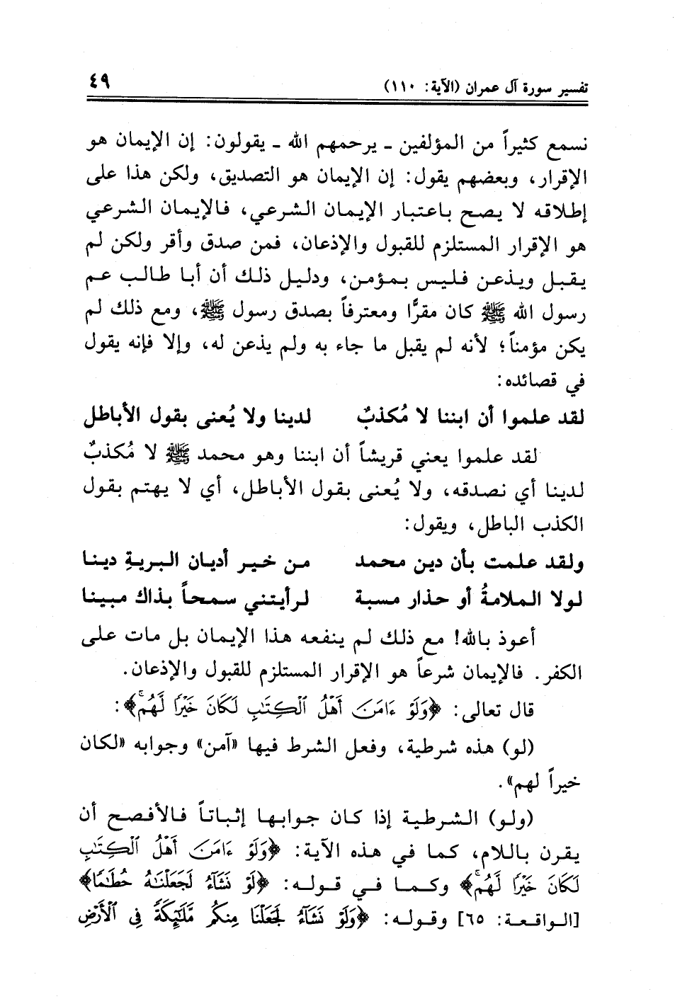 نسمع كثيرًا من المؤلفين -يرحمهم الله- يقولون: إن الإيمان هو الإقرار، وبعضهم يقول: إن الإيمان هو التصديق، ولكن هذا على إطلاقه لا يصح باعتبار الإيمان الشرعي، فالإيمان الشرعي هو الإقرار المستلزم للقبول والإذعان، فمن صدق وأقر ولكن لم يقبل ويذعن فليس بمؤمن، ودليل ذلك أن أبا طالب عم رسول الله - صلى الله عليه وسلم - كان مقرًّا ومعترفا بصدق رسول [الله] [*]- صلى الله عليه وسلم -، ومع ذلك لم يكن مؤمنًا؛ لأنه لم يقبل ما جاء به ولم يذعن له، وإلا فإنه يقول في قصائده:
