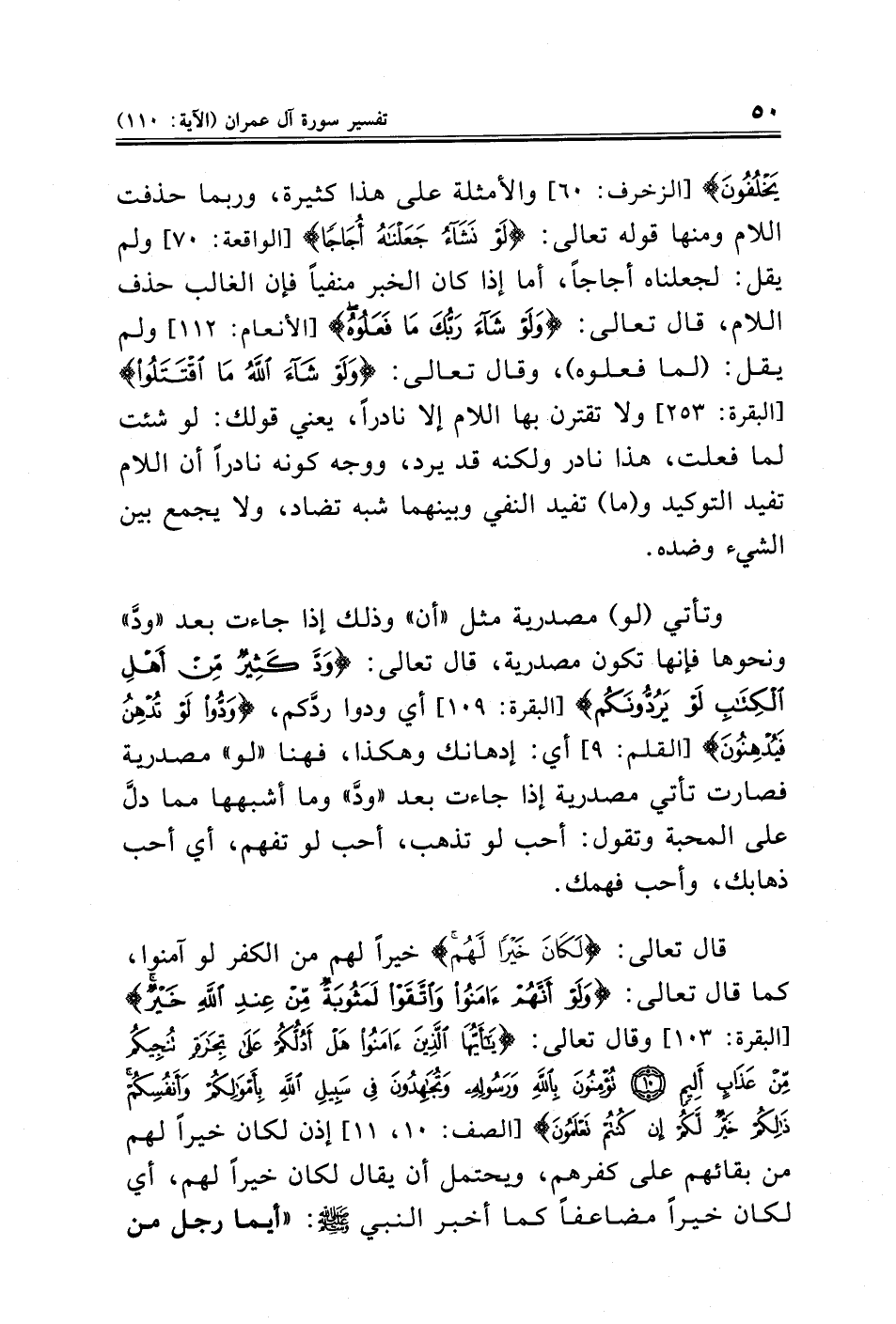 وتأتي (لو) مصدرية مثل "أن" وذلك إذا جاءت بعد "ودَّ" ونحوها فإنها تكون مصدرية، قال تعالى: {وَدَّ كَثِيرٌ مِنْ أَهْلِ الْكِتَابِ لَوْ يَرُدُّونَكُمْ} [البقرة: ١٠٩] أي ودوا ردَّكم، {وَدُّوا لَوْ تُدْهِنُ فَيُدْهِنُونَ} [القلم: ٩] أي: إدهانك وهكذا، فهنا "لو" مصدرية فصارت تأتي مصدرية إذا جاءت بعد "ودَّ" وما أشبهها مما دلَّ على المحبة وتقول: أحب لو تذهب، أحب لو تفهم، أي أحب ذهابك، وأحب فهمك.
