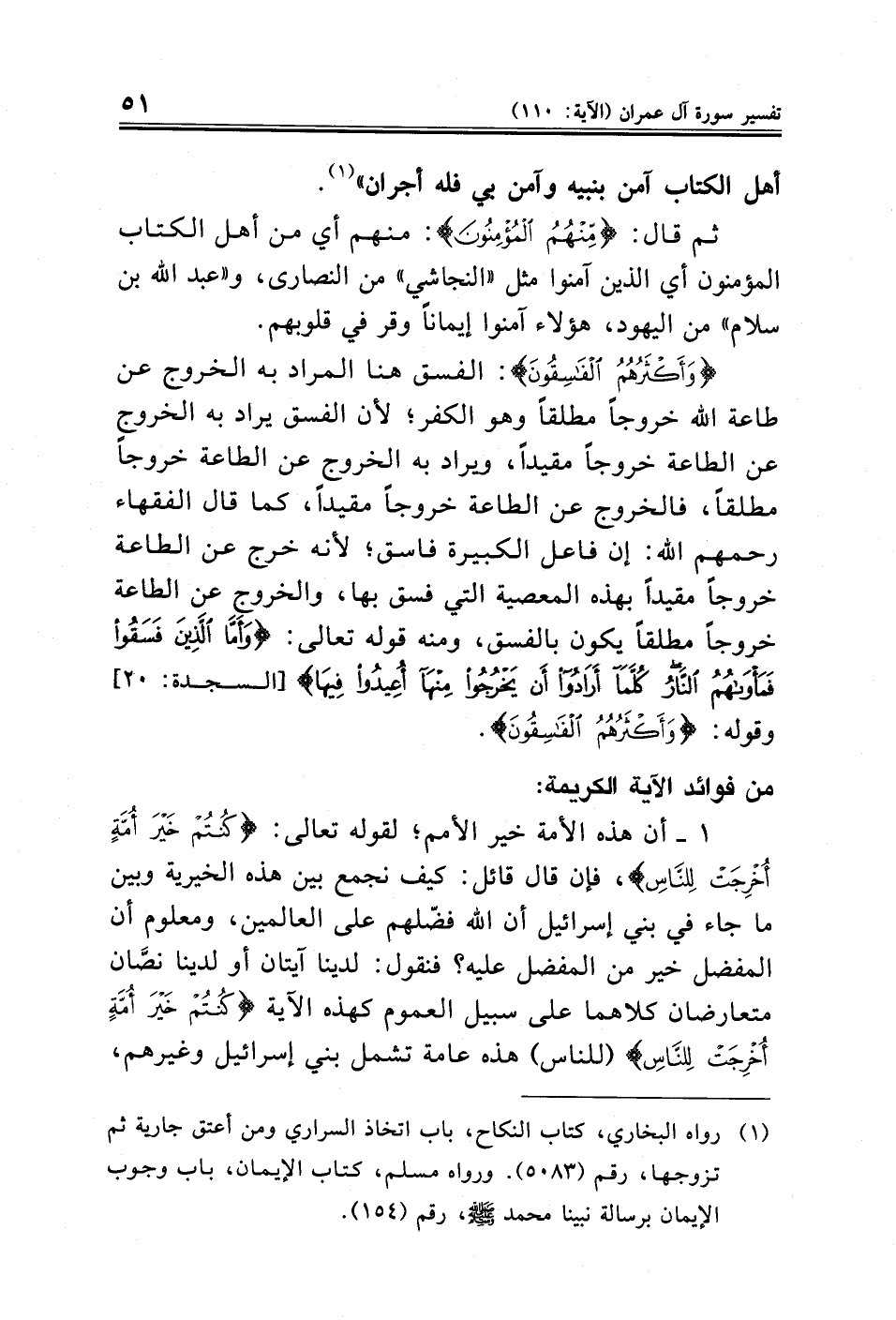 ١ - أن هذه الأمة خير الأمم؛ لقوله تعالى: {كُنْتُمْ خَيْرَ أُمَّةٍ أُخْرِجَتْ لِلنَّاسِ}، فإن قال قائل: كيف نجمع بين هذه الخيرية وبين ما جاء في بني إسرائيل أن الله فضّلهم على العالمين، ومعلوم أن المفضل خير من المفضل عليه؟ فنقول: لدينا آيتان أو لدينا نصَّان متعارضان كلاهما على سبيل العموم كهذه الآية {كُنْتُمْ خَيْرَ أُمَّةٍ أُخْرِجَتْ لِلنَّاسِ} (للناس) هذه عامة تشمل بني إسرائيل وغيرهم،