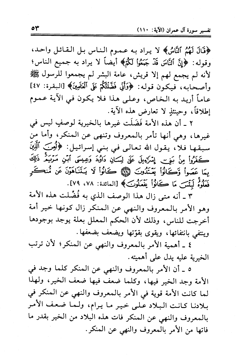 ٢ - أن هذه الأمة فَضَلَت غيرها بالخيرية لوصفٍ ليس في غيرها، وهي أنها تأمر بالمعروف وتنهى عن المنكر، وأما من سبقها فلا، يقول الله تعالى في بني إسرائيل: {لُعِنَ الَّذِينَ كَفَرُوا مِنْ بَنِي إِسْرَائِيلَ عَلَى لِسَانِ دَاوُودَ وَعِيسَى ابْنِ مَرْيَمَ ذَلِكَ بِمَا عَصَوْا وَكَانُوا يَعْتَدُونَ (٧٨) كَانُوا لَا يَتَنَاهَوْنَ عَنْ مُنْكَرٍ فَعَلُوهُ لَبِئْسَ مَا كَانُوا يَفْعَلُونَ} [المائدة: ٧٨، ٧٩].