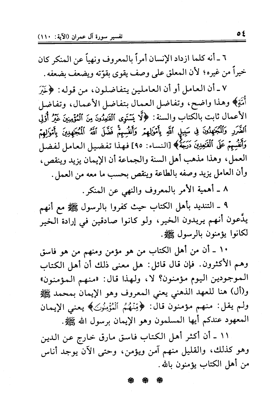 ١٠ - أن من أهل الكتاب من هو مؤمن ومنهم من هو فاسق وهم الأكثرون. فإن قال قائل: هل معنى ذلك أن أهل الكتاب الموجودين اليوم مؤمنون؟ لا, ولهذا قال: "منهم المؤمنون" و (أل) هنا للعهد الذهني يعني المعروف وهو الإيمان بمحمد - صلى الله عليه وسلم - ولم يقل: منهم مؤمنون قال: {مِنْهُمُ الْمُؤْمِنُونَ} يعني الإيمان المعهود عندكم أيها المسلمون وهو الإيمان برسول الله - صلى الله عليه وسلم -.