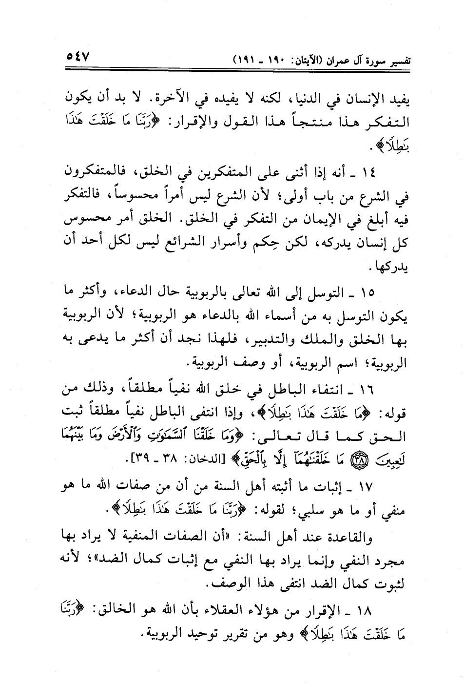 ١٦ - انتفاء الباطل في خلق الله نفيًا مطلقًا، وذلك من قوله: {مَا خَلَقْتَ هَذَا بَاطِلًا}، وإذا انتفى الباطل نفيًا مطلقًا ثبت الحق كما قال تعالى: {وَمَا خَلَقْنَا السَّمَاوَاتِ وَالْأَرْضَ وَمَا بَيْنَهُمَا لَاعِبِينَ (٣٨) مَا خَلَقْنَاهُمَا إِلَّا بِالْحَقِّ} [الدخان: ٣٨ - ٣٩].