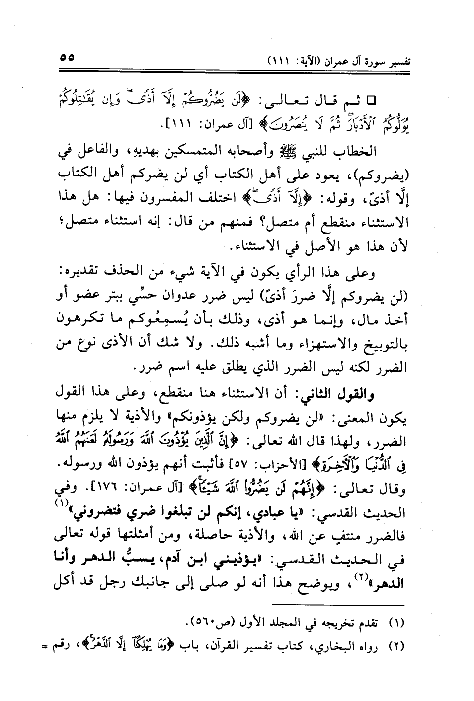 والقول الثاني: أن الاستثناء هنا منقطع، وعلى هذا القول يكون المعنى: "لن يضروكم ولكن يؤذونكم" والأذية لا يلزم منها الضرر، ولهذا قال الله تعالى: {إِنَّ الَّذِينَ يُؤْذُونَ اللَّهَ وَرَسُولَهُ لَعَنَهُمُ اللَّهُ فِي الدُّنْيَا وَالْآخِرَةِ} [الأحزاب: ٥٧] فأثبت أنهم يؤذون الله ورسوله. وقال تعالى: {إِنَّهُمْ لَنْ يَضُرُّوا اللَّهَ شَيْئًا} [آل عمران: ١٧٦]. وفي الحديث القدسي: "يا عبادي، إنكم لن تبلغوا ضري فتضروني" (¬١) فالضرر منتفٍ عن الله، والأذية حاصلة، ومن أمثلتها قوله تعالى في الحديث القدسي: "يؤذيني ابن آدم، يسبُّ الدهر وأنا الدهر" (¬٢)، ويوضح هذا أنه لو صلى إلى جانبك رجل قد أكل