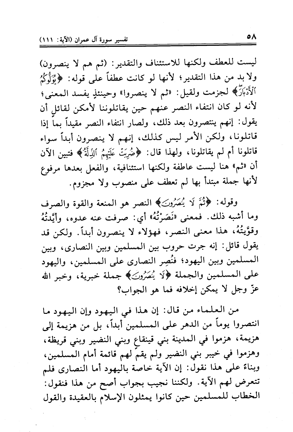 من العلماء من قال: إن هذا في اليهود وإن اليهود ما انتصروا يومًا من الدهر على المسلمين أبدًا، بل من هزيمة إلى هزيمة، هزموا في المدينة بني قينقاعٍ وبني النضير وبني قريظة، وهزموا في خيبر بني النضير ولم يقم لهم قائمة أمام المسلمين، وبناءً على هذا نقول: إن الآية خاصة باليهود أما النصارى فلم تتعرض لهم الآية. ولكننا نجيب بجواب أصح من هذا فنقول: الخطاب للمسلمين حين كانوا يمثلون الإِسلام بالعقيدة والقول
