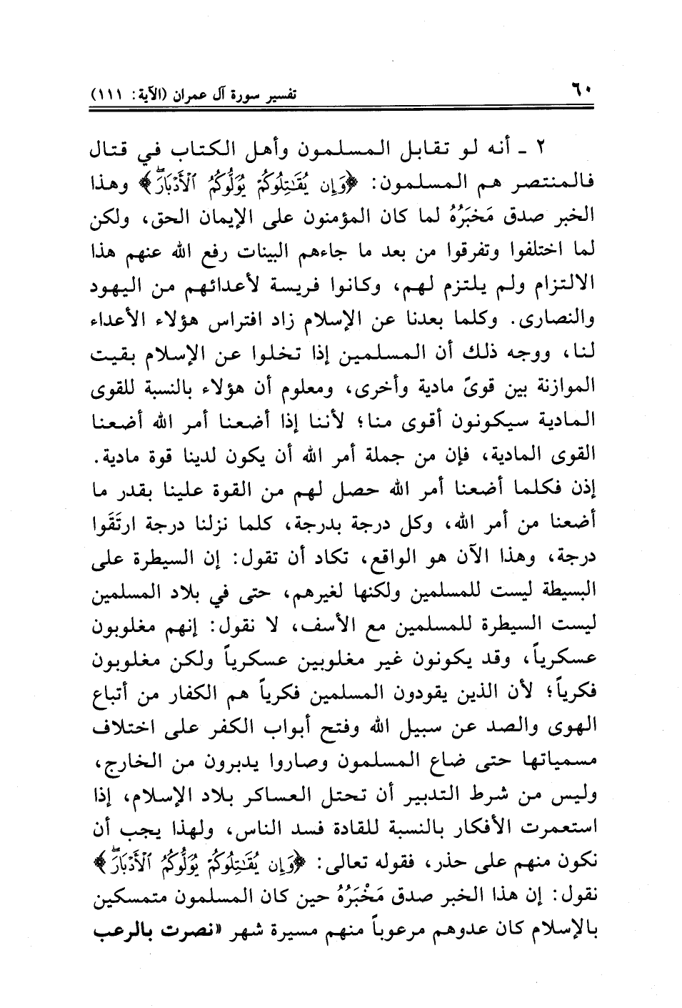 ٢ - أنه لو تقابل المسلمون وأهل الكتاب في قتال فالمنتصر هم المسلمون: {وَإِنْ يُقَاتِلُوكُمْ يُوَلُّوكُمُ الْأَدْبَارَ} وهذا الخبر صدق مَخبَرُهُ لما كان المؤمنون على الإيمان الحق، ولكن لما اختلفوا وتفرقوا من بعد ما جاءهم البينات رفع الله عنهم هذا الالتزام ولم يلتزم لهم، وكانوا فريسة لأعدائهم من اليهود والنصارى. وكلما بعدنا عن الإِسلام زاد افتراس هؤلاء الأعداء لنا، ووجه ذلك أن المسلمين إذا تخلوا عن الإِسلام بقيت الموازنة بين قوىً مادية وأخرى، ومعلوم أن هؤلاء بالنسبة للقوى المادية سيكونون أقوى منا؛ لأننا إذا أضعنا أمر الله أضعنا القوى المادية، فإن من جملة أمر الله أن يكون لدينا قوة مادية. إذن فكلما أضعنا أمر الله حصل لهم من القوة علينا بقدر ما أضعنا من أمر الله، وكل درجة بدرجة، كلما نزلنا درجة ارتَقَوا درجة، وهذا الآن هو الواقع، تكاد أن تقول: إن السيطرة على البسيطة ليست للمسلمين ولكنها لغيرهم، حتى في بلاد المسلمين ليست السيطرة للمسلمين مع الأسف، لا نقول: إنهم مغلوبون عسكريًا، وقد يكونون غير مغلوبين عسكريا ولكن مغلوبون فكريًا؛ لأن الذين يقودون المسلمين فكريًا هم الكفار من أتباع الهوى والصد عن سبيل الله وفتح أبواب الكفر على اختلاف مسمياتها حتى ضاع المسلمون وصاروا يدبرون من الخارج، وليس من شرط التدبير أن تحتل العساكر بلاد الإِسلام، إذا استعمرت الأفكار بالنسبة للقادة فسد الناس، ولهذا يجب أن نكون منهم على حذر، فقوله تعالى: {وَإِنْ يُقَاتِلُوكُمْ يُوَلُّوكُمُ الْأَدْبَارَ} نقول: إن هذا الخبر صدق مَخْبَرُهُ حين كان المسلمون متمسكين بالإِسلام كان عدوهم مرعوبًا منهم مسيرة شهر "نصرت بالرعب
