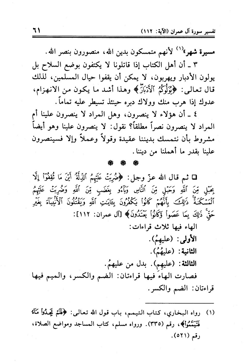 ٣ - أن أهل الكتاب إذا قاتلونا لا يكتفون بوضع السلاح بل يولون الأدبار ويهربون، لا يمكن أن يقفوا حيال المسلمين، لذلك قال تعالى: {يُوَلُّوكُمُ الْأَدْبَارَ} وهذا أشد ما يكون من الانهزام، عدوك إذا هرب منك وولاك دبره حينئذ تسيطر عليه تمامًا.